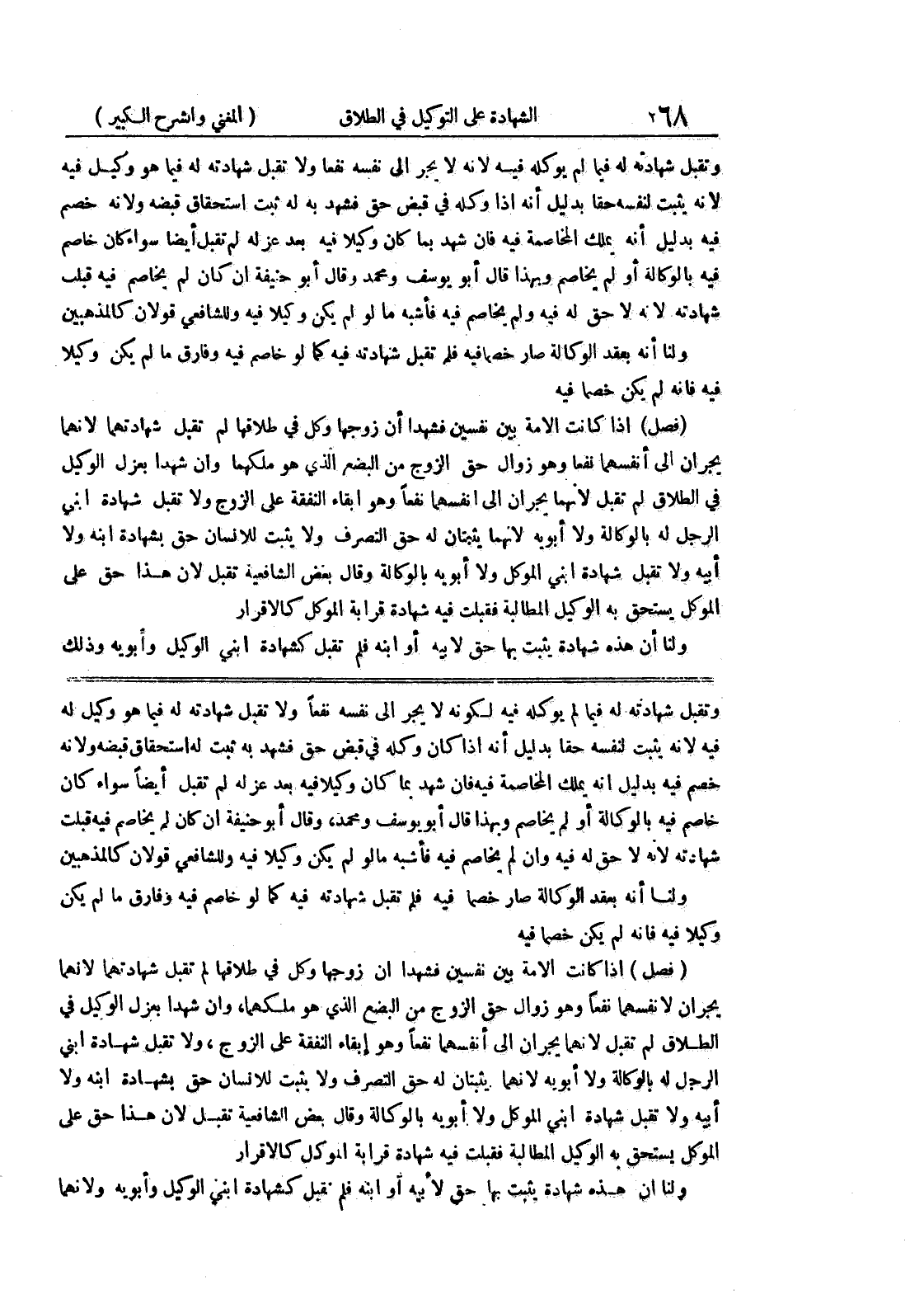 وتقبل شهادته له فيما لم يوكله فيه لكونه لا يجر إلى نفسه نفعاً ولا تقبل شهادته له فيما هو وكيل له فيه لأنه يثبت لنفسه حقا بدليل أنه إذا كان وكله في قبض حق فشهد به ثبت له استحقاق قبضه ولأنه خصم فيه بدليل أنه يملك المخاصمة فيه فإن شهد بما كان وكيلاً فيه بعد عزله لم تقبل أيضاً سواء كان خاصم فيه بالوكالة أو لم يخاصم وبهذا قال أبو يوسف ومحمد وقال أبو حنيفة ان كان لم يخاصم فيه قبلت شهادته لأنه لاحق له فيه وإن لم يخاصم فيه فأشبه مالو لم يكن وكيلاً فيه وللشافعي قولان كالمذهبين ولنا أنه بعقد الوكالة صار خصماً فيه فلم تقبل شهادته فيه كما لو خاصم فيه وفارق ما لم يكن وكيلاً فيه فإنه لم يكن خصماً فيه (فصل) إذا كانت الأمة بين نفسين فشهدا أن زوجها وكل في طلاقها لم تقبل شهادتهما لأنهما يجران لأنفسهما نفعاً وهو زوال حق الزوج من البضع الذي هو ملكهما، وإن شهدا بعزل الوكيل في الطلاق لم تقبل لأنهما يجران إلى أنفسهما نفعاً وهو إبقاء النفقة على الزوج، ولا تقبل شهادة إبني الرجل له بالوكالة ولا أبويه لأنهما يثبتان له حق التصرف ولا يثبت للإنسان حق بشهادة إبنه ولا أبيه ولا تقبل شهادة إبني الموكل ولا أبويه بالوكالة وقال بعض الشافعية تقبل لأن هذا حق على الموكل يستحق به الوكيل المطالبة فقبلت فيه شهادة قرابة الموكل كالإقرار ولنا أن هذه شهادة ثبت بها حق لأبيه أو ابنه فلم تقبل كشهادة ابني الوكيل وأبويه ولأنهما