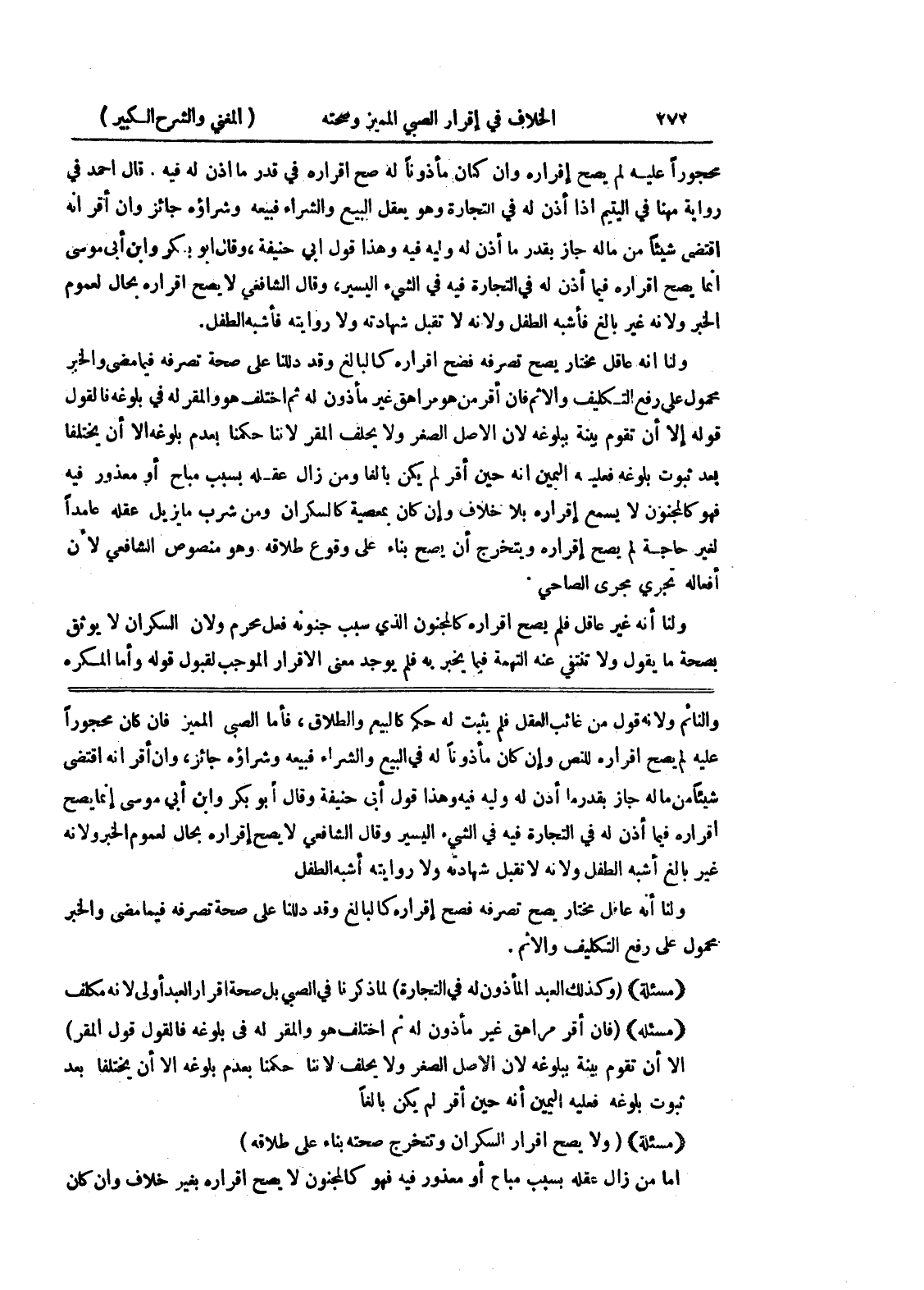 إقراره فيما أذن له في التجارة فيه في الشئ اليسير وقال الشافعي لا يصح إقراره بحال لعموم الخبر ولأنه غير بالغ أشبه الطفل ولأنه لا تقبل شهادته ولا روايته أشبه الطفل ولنا أنه عامل مختار يصح تصرفه فصح إقراره كالبالغ وقد دللنا على صحة تصرفه فيما مضى والخبر محمول على رفع التكليف والإثم.