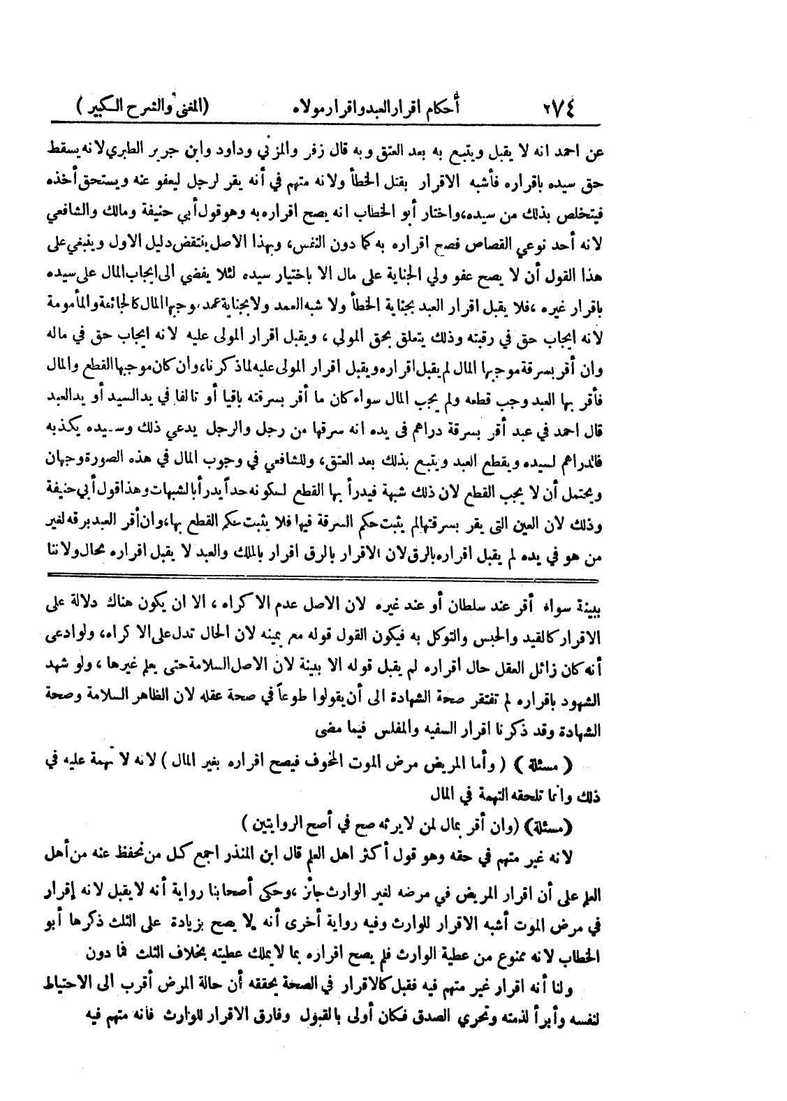 ببينة سواء أقر عنه سلطان أو عند غيره لأن الأصل عدم الإكراه، إلا أن يكون هناك دلالة على الإقرار كالقيد والحبس والتوكل به فيكون القول قوله مع يمينه لأن الحال تدل على الإكراه، ولو ادعى أنه كان زائل العقل حال إقراره لم يقبل قوله إلا بينة لأن الأصل السلامة حتى يعلم غيرها، ولو شهد الشهود بإقراره لم تفتقر صحة الشهادة إلى أن يقولوا طوعاً في صحة عقله لأن الظاهر السلامة وصحة الشهادة وقد ذكرنا إقرار السفيه والمفلس فيما مضى * (مسألة) * (وأما المريض مرض الموت المخوف فيصح إقراره بغير المال) لأنه لا تهمة عليه في ذلك وانما تلحقه التهمة في المال (مسألة) (وإن أقر بمال لمن لا يرثه صح في أصح الروايتين) لأنه غير متهم في حقه وهو قول أكثر أهل العلم قال ابن المنذر أجمع كل من نحفظ عنه من أهل العلم على أن إقرار المريض في مرضه لغير الوارث جائز، وحكى أصحابنا رواية أنه لا يقبل لأنه إقرار في مرض الموت أشبه الإقرار للوارث وفيه رواية أخرى أنه لا يصح بزيادة على الثلث ذكرها أبو الخطاب لأنه ممنوع من عطية الوارث فلم يصح إقراره بما لا يملك عطيته بخلاف الثلث فما دون ولنا أنه إقرار غير متهم فيه فقبل كالإقرار في الصحة يحققه أن حالة المرض أقرب إلى الاحتياط لنفسه وأبرأ لذمته وتحري الصدق فكان أولى بالقبول وفارق الإقرار للوارث فإنه متهم فيه
