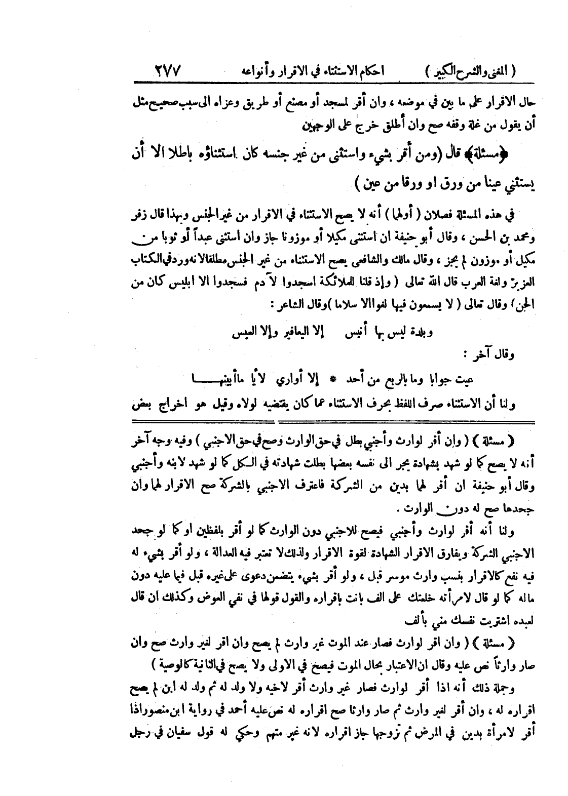 (مسألة) (وإن أقر الوارث وأجنبي بطل في حق الوارث وصح في حق الأجنبي) وفيه وجه آخر أنه لا يصح كما لو شهد بشهادة يجر إلى نفسه بعضها بطلت شهادته في الكل كما لو شهد لابنه وأجنبي وقال أبو حنيفة إن أقر لهما بدين من الشركة فاعترف الأجنبي بالشركة صح الإقرار لهما وإن جحدها صح له دون الوارث.