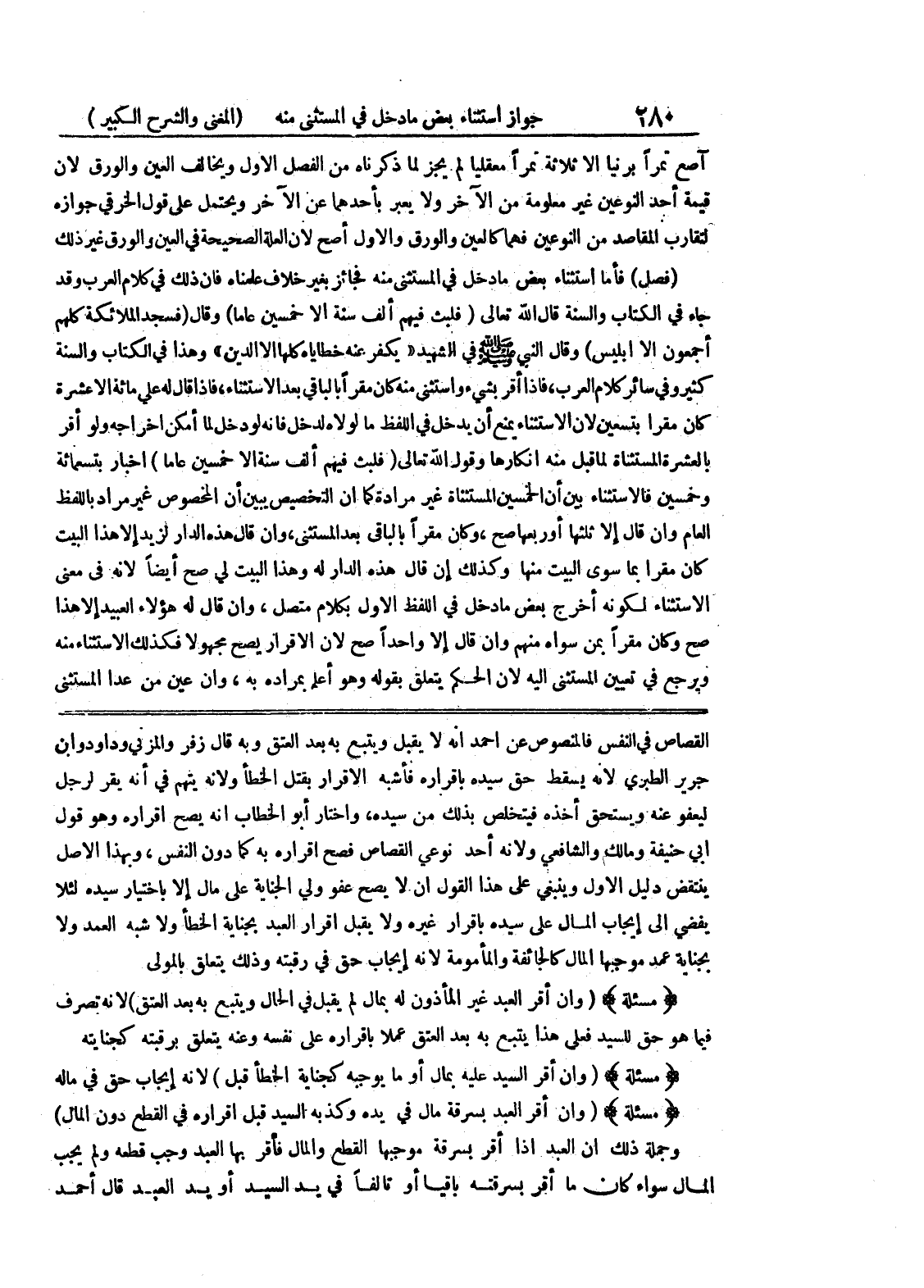 القصاص في النفس فالمنصوص عن أحمد أنه لا يقبل ويتبع به بعد العتق وبه قال زفر والمزني وداود وابن جرير الطبري لأنه يسقط حق سيده باقراره فأشبه الإقرار بقتل الخطأ ولأنه يتهم في أنه يقر لرجل ليعفو عنه ويستحق أخده فيتخلص بذلك من سيده، واختار أبو الخطاب أنه يصح إقراره وهو قول أبي حنيفة ومالك والشافعي ولأنه أحد نوعي القصاص فصح اقرره به كما دون النفس، وبهذا الأصل ينتقض دليل الأول وينبغي على هذا القول أن لا يصح عفو ولي الجناية على مال إلا باختيار سيده لئلا يفضي إلى إيجاب المال على سيده بإقرار غيره ولا يقبل اقرار العبد بجناية الخطأ ولا شبه العمدولا بجناية عمد موجبها المال كالجائفة والمأمومة لأنه إيجاب حق في رقبته وذلك بتعلق بالمولى (مسألة) (وإن أقر العبد غير المأذون له بمال لم يقبل في الحال ويتبغ به بعد العتق) لأنه تصرف فيما هو حق للسيد فعلى هذا يتبع به بعد العتق عملا بإقراره على نفسه وعنه يتعلق برقبته كجنايته (مسألة) (وإن أقر السيد عليه بمال أو ما يوجبه كجناية الخطأ قبل) لأنه إيجاب حق في ماله (مسألة) (وإن أقر العبد بسرقة مال في يده وكذبه السيد قبل إقراره في القطع دون المال) وجملة ذلك أن العبد إذا أقر بسرقة موجبها القطع والمال فأقر بها العبد وجب قطعه ولم يجب المال سواء كان ما أقر بسرقته باقياً أو تالفاً في يد السيد أو يد العبد قال أحمد