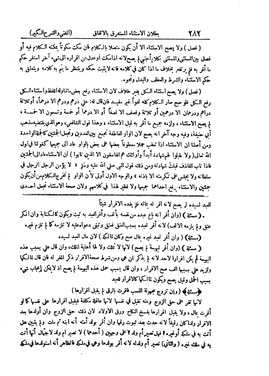 العبد لسيده لم يصح لأنه أقر له بماله فلم يفده الإقرار شيئاً (مسألة) (وإن أقر إنه باع عبده من نفسه بألف وأقر العبد به ثبت ويكون كالكتابة وإن أنكر عتق ولم يلزمه الألف) لان أقر لعبده بسبب العتق فتعق وتبقى دعواه عليه لا تلزمه كما لم تلزم غيره (مسألة) (وإن أقر لعبد غيره بمال صح وكان لمالكه) لأن مال العبد لسيده (مسألة) (وإن أقر لبهيمة لم يصح) لأنها لا تملك ولا لها أهلية الملك، وإن قال على بسبب هذه البهيمة لم يكن إقراراً لأحد لأنه لم يذكر لمن هي ومن شرط صحة الإقرار ذكر المقر له فإن قال لمالكها ولزيد علي بسببها ألف صح الاقرار، وإن قال بسبب حمل هذه البهيمة لم يصح إذ لا يمكن ايجاب شئ بسبب الحمل وقيل يصح ويكون لما لكها كالإقرار للعبد (مسألة) (وإن تزوج مجهولة النسب فأقرت بالرق لم يقبل اقزارها)