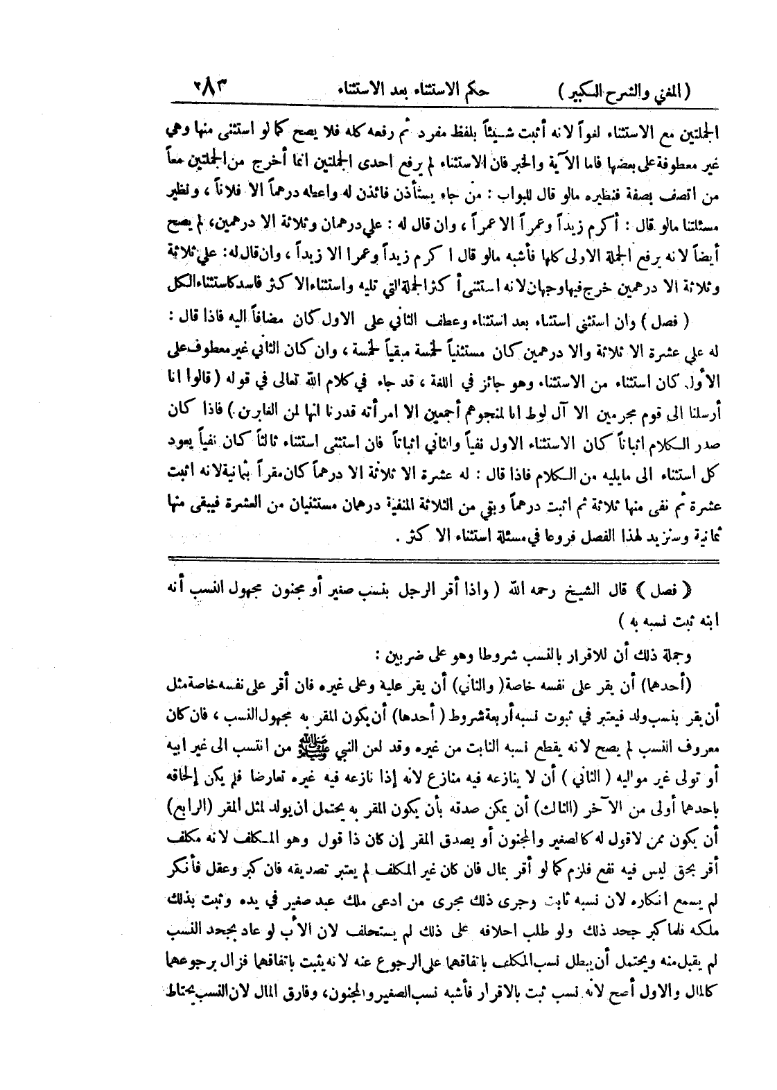 (فصل) قال الشيخ رحمه الله (وإذا أقر الرجل نسب صغير أو مجنون مجهول النسب أنه ابنه ثبت نسبه به) وجملة ذلك أن للإقرار بالنسب شروطاً وهو على ضربين: (أحدهما) أن يقر على نفسه خاصة (والثاني) أن يقر عليه وعلى غيره فإن أقر على نفسه خاصة مثل أن يقر بنسب ولد فيعتبر في ثبوت نسبه أربعة شروط (أحدها) أن يكون المقر به مجهول النسب، فإن كان معروف النسب لم يصح لأنه يقطع نسبه الثابت من غيره وقد لعن النبي صلى الله عليه وسلم من انتسب إلى غير أبيه أو تولى غير مواليه (الثاني) أن لا ينازعه فيه منازع لأنه إذا نازعه فيه غيره تعارضا فلم يكن إلحاقه بأحدهما أولى من الآخر (الثالث) أن يمكن صدقه بأن يكون المقر به يحتمل أن يولد لمثل المقر (الرابع) أن يكون ممن لا قول له كالصغير والمجنون أو يصدق المقر إن كان ذا قول وهو المكلف لانه ملكف أقر بحق ليس فيه نفع فلزم كما لو اقر بمال فإن كان غير المكلف لم يعتبر تصديقه فإن كبر وعقل فأنكر لم يسمع إنكاره لأن نسبه ثابت وجرى ذلك مجرى من ادعى ملك عبد صغير في يده وثبت بذلك ملكه فلما كبر جحد ذلك ولو طلب إحلافه على ذلك لم يستحلف لأن الأب لو عاد بجحد النسب لم يقبل منه ويحتمل أن يبطل نسب المكلف باتفاقهما على الرجوع عنه لأنه يثبت باتفاقهما فزال برجوعهما كالمال والأول أصح لأنه نسب ثبت بالإقرار فأشبه نسب الصغير والمجنون، وفارق المال لأن النسب يحتاط