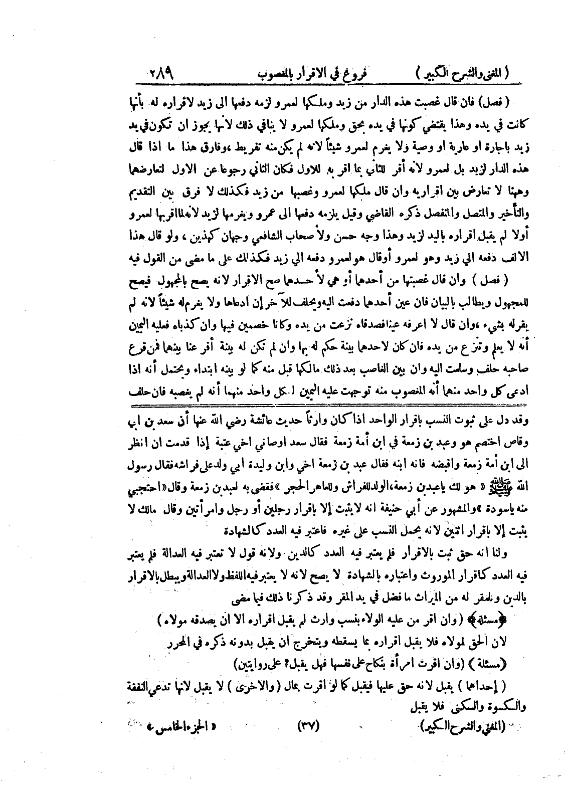 وقد دل على ثبوت النسب بإقرار الواحد إذا كان وارثاً حديث عائشة رضي الله عنها أن سعد بن أبي وقاص اختصم هو وعبد بن زمعة في ابن أمة زمعة فقال سعد أوصاني أخي عتبة إذا قدمت أن أنظر إلى ابن أمة زمعة واقبضه فإنه ابنه فقال عبد بن زمعة أخي وابن وليدة أبي ولد على فراشه فقال رسول الله صلى الله عليه وسلم (هو لك يا عبدبن زمعة، الولد للفراش وللعاهر الحجر) فقضى به لعبد بن زمعة وقال (احتجبي منه يا سودة) والمشهور عن أبي حنيفة أنه لا يثبت إلا بإقرار رجلين أو رجل وامرأتين وقال مالك لا يثبت إلا بإقرار اثنين لأنه يحمل النسب على غيره فاعتبر فيه العدد كالشهادة ولنا أنه حق ثبت بالاقرار فلم يعتبر فيه العدد كالدين ولأنه قول لا يعتبر فيه العدالة فلم يعتبر فيه العدد كإقرار الموروث واعتباره بالشهادة لا يصح لأنه لا يعتبر فيه اللفظ ولا العدالة ويبطل بالإقرار بالدين وللمقر له من الميراث ما فضل في يد المقر وقد ذكرنا ذلك فيما مضى (مسألة) (وإن أقر من عليه الولاء بنسب وارث لم يقبل إقراره إلا أن يصدقه مولاه لأن الحق لمولاه فلا يقبل إقراره بما يسقطه ويتخرج أن يقبل بدونه ذكره في المحرر