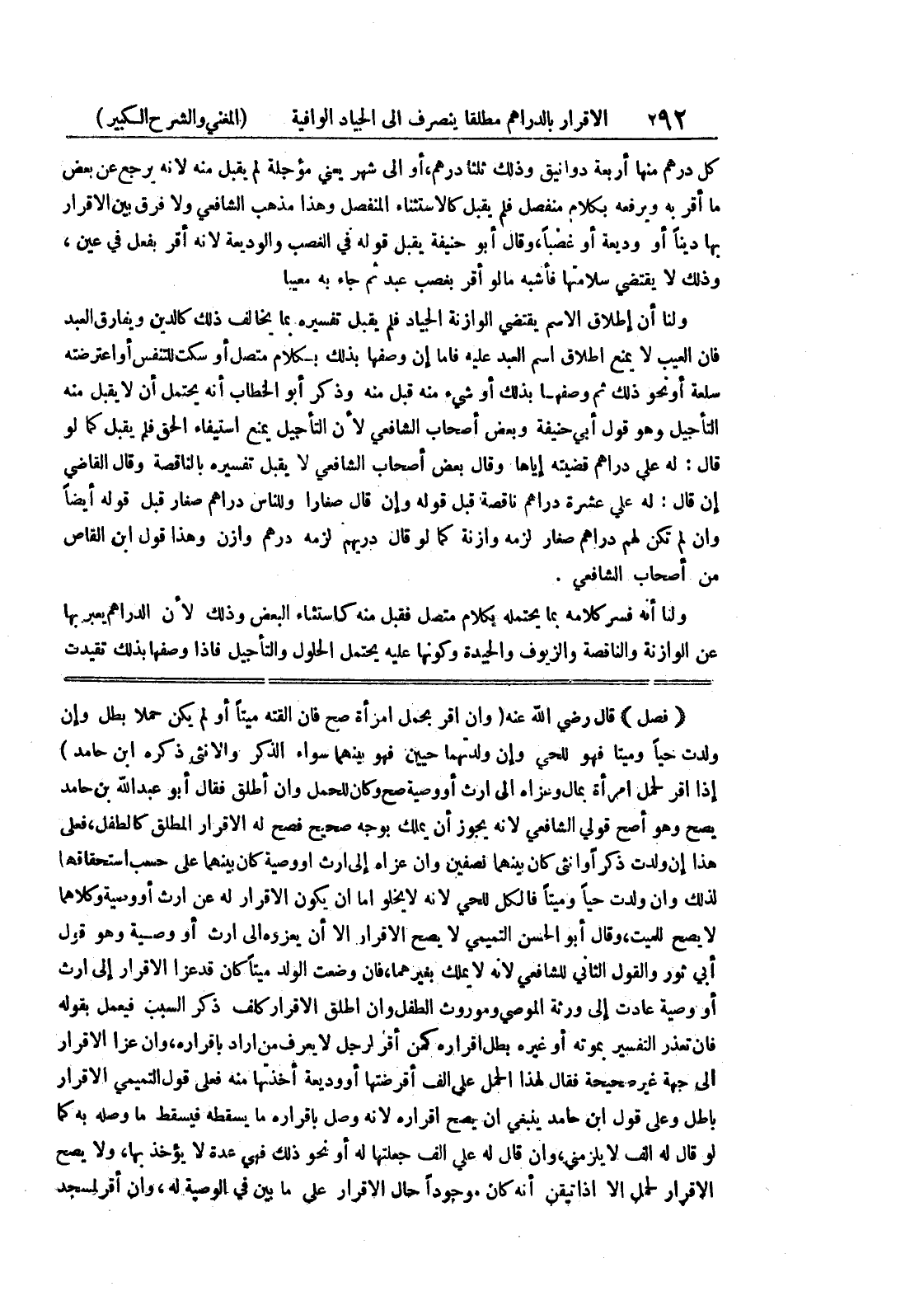 (فصل) قال رضي الله عنه (وإن أقر بحمل امرأة صح فإن ألقته ميتاً أو لم يكن حملاً بطل وإن ولدت حياً وميتاً فهو للحي وإن ولدتهما حيين فهو بينهما سواء الذكر والاثنى ذكره ابن حامد) إذا أقر لحمل امرأة بمال وعزاه إلى إرث أو وصية صح وكان للحمل وإن أطلق فقال أبو عبد الله بن حامد يصح وهو أصح قولي الشافعي لأنه يجوز أن يملك بوجه صحيح فصح له الإقرار المطلق كالطفل، فعلى هذا إن ولدت ذكر أو أنثى كان بينهما نصفين وإن عزاه إلى إرث أو وصية كان بينهما على حسب استحقاقها لذلك وإن ولدت حياً وميتاً فالكل للحي لأنه لا يخلو إما أن يكون الإقرار له عن إرث أو وصية وكلاهما لا يصح للميت، وقال أبو الحسن التميمي لا يصح الإقرار إلا أن يعزوه إلى إرث أو وصية وهو قول أبي ثور والقول الثاني للشافعي لأنه لا يملك بغيرهما، فإن وضعت الولد ميتاً كان قد عزا الإقرار إلى إرث أو وصية عادت إلى ورثة الموصي وموروث الطفل وإن أطلق الإقرار كلف ذكر السبب فيعمل بقوله