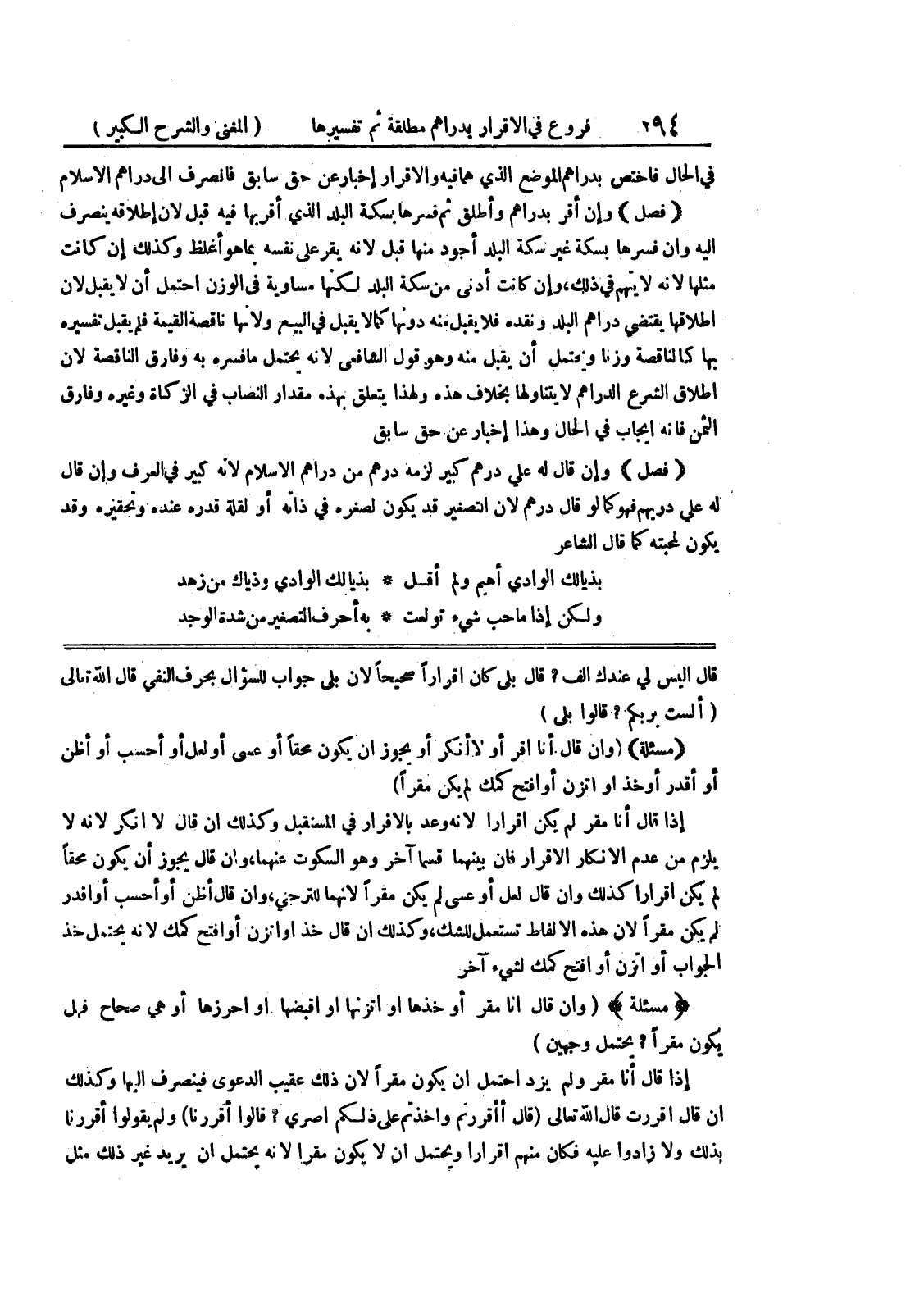 (مسألة) (وإن قال أنا اقر أولا أنكر أو يجوز أن يكون محقاً وعسى أو لعل أو أحسب أو أظن أو أقدر أوخذ أو اتزن أو افتح كمك لم يكن مقرا إذا قال أنا مقر لم يكن إقراراً لأنه وعد بالإقرار في المستقبل وكذلك إن قال لا أنكر لأنه لا يلزم من عدم الإنكار الإقرار فإن بينهما قسماً آخر وهو السكوت عنهما، وإن قال يجوز أن يكون محقاً لم يكن إقراراً كذلك وإن قال لعل أو عسى لم يكن مقرا لأنهما للترجي، وإن قال أظن أو أحسب أو أقدر لم يكن مقرا لأن هذه الألفاظ تستعمل للشك، وكذلك إن قال خذ أو اتزن أو افتح كمك لأنه يحتمل خذ الجواب أو اتزن أو افتح كمك لشئ آخر (مسألة) (وإن قال أنا مقر أو خذها أو اتزنها أو اقبضها أو احرزها أو هي صاح فهل يكون مقراً؟ يحتمل وجهين) إذا قال أنا مقر ولم يزد احتمل أن يكون مقراً لأن ذلك عقيب الدعوى فينصرف إليها وكذلك إن قال أقررت قال الله تعالى (قال أأقررتم وأخذتم على ذلكم إصري؟ قالو أقررنا) ولم يقولوا أقررنا بذلك ولا زادوا عليه فكان منهم إقراراً ويحتمل أن لا يكون مقراً لأنه يحتمل أن يريد غير ذلك مثل