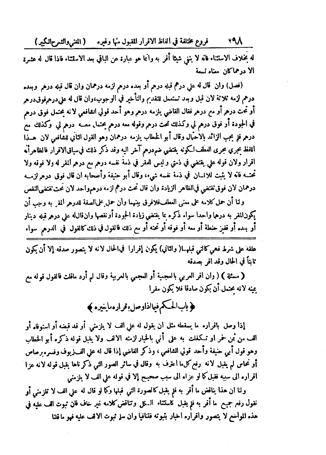 علقه على شرط فهي كالتي قبلها (والثاني) يكون إقرارا في الحال لأنه لا يتصور صدقه إلا أن يكون ثابتاً في الحال وقد أقر بصدقه (مسألة) (وإن أقر العربي بالعجمية أو العجمي بالعربية وقال لم أرد ما قلت فالقول قوله مع يمينه لأنه يحتمل أن يكون صادقاً فلا يكون مقراً (باب الحكم فيما إذا وصل بإقراره ما يغيره) إذا وصل بإقراره ما يسقطه مثل أن يقول له على ألف لا يلزمني أو قد قبضه أو استوفاه أو ألف من ثمن خمر أو تكلفت به على أني بالخيار لزمته الألف ولا يقبل قوله ذكره أبو الخطاب وهو قول أبي حنيفة وأحد قولي الشافعي، وذكر القاضي إذا قال له علي ألف زيوف وفسره برصاص