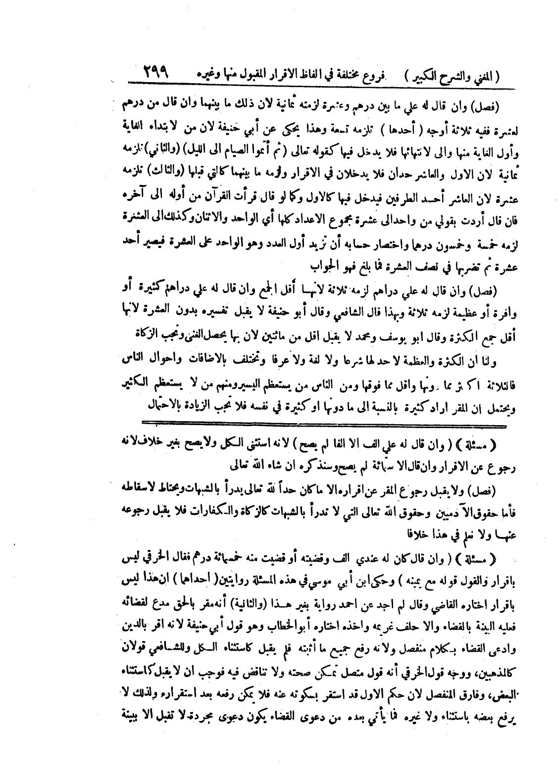 (مسألة) (وإن قال له على ألف إلا ألفاً لم يصح) لأنه استثنى الكل ولا يصح بغير خلاف لأنه رجوع عن الاقرار وإن قال الاسمائة لم يصح وسنذكره إن شاء الله تعالى (فصل) ولا يقبل رجوع المقر عن إقراره إلا ماكان حداً لله تعالى يدرأ بالشبهات ويحتاط لا سقاطه فأما حقوق الآدميين وحقوق الله تعالى التي لا تدرأ بالشبهات كالزكاة والكفارات فلا يقبل رجوعه عنها ولا نعلم في هذا خلافاً (مسألة) (وإن قال كان له عندي ألف وقضيته أو قضيت منه خمسمائة درهم فقال الخرقي ليس بإقرار والقول قوله مع يمينه) وحكى ابن أبي موسى في هذه المسألة روايتين (أحدهما) أن هذا ليس بإقرار اختاره القاضي وقال لم أجد عن أحمد رواية بغير هذا (والثانية) أنه مقر بالحق مدع لقضائه فعليه البينة بالقضاء والاحلف غريمه وأخذه اختاره أبو الخطاب وهو قول أبي حنيفة لأنه أقر بالدين وادعى القضاء بكلام منفصل ولأنه رفع جميع ما أثبته فلم يقبل كاستثناء الكل وللشافعي قولان كالمذهبين، ووجه قول الخرقي أنه قول متصل تمكن صحته ولا تناقض فيه فوجب أن لا يقبل كاستثناء البعض، وفارق المنفصل لأن حكم الأول قد استقر بسكوته عنه فلا يمكن رفعه بعد استقراره ولذلك لا يرفع بعضه باستثناء ولا غيره فما يأتي بعده من دعوى القضاء يكون دعوى مجردة لا تقبل إلا بينة