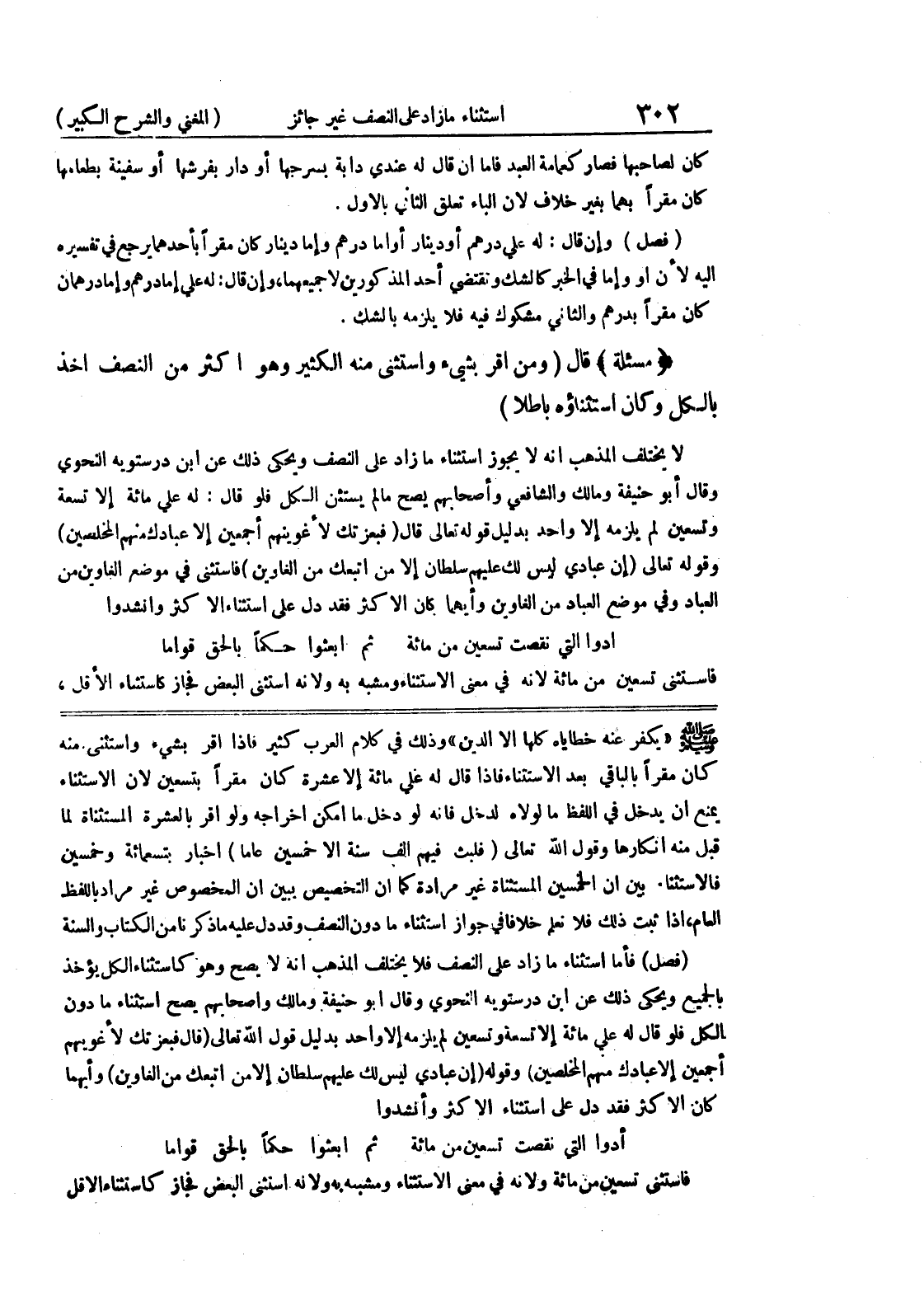 بين أن الخمسين المستثناة غير مرادة كما أن التخصيص يبين أن المخصوص غير مراد باللفظ العام إذا ثبت ذلك فلا نعلم خلافاً في جواز استثناء ما دون النصف وقد دل عليه ما ذكرنا من الكتاب والسنة (فصل) فأما استثناء ما زاد على النصف فلا يختلف المذهب أنه لا يصح وهو كاستثناء الكل يؤخذ بالجميع ويحكى ذلك عن ابن درستويه النحوي وقال أبو حنيفة ومالك وأصحابهم يصح استثناء ما دون الكل فلو قال له على مائة إلا تسعة وتسعين لم يلزمه إلا واحد بدليل قول الله تعالى (قال فبعزتك لاغويهم أجميعن إلا عبادك منهم المخلصين) وقوله (إن عبادي ليس لك عليهم سلطان إلا من اتبعك من الغاوين) وأيهما كان الأكثر فقد دل على استثناء الأكثر وأنشدوا أدوا التي نقصت تعسين من مائة ثم ابعثوا حكماً بالحق قواما فاستثنى تسعين من مائة ولأنه في معنى الاستثناء ومشبه به ولأنه استثنى البعض فجاز كاستثناء الأقل
