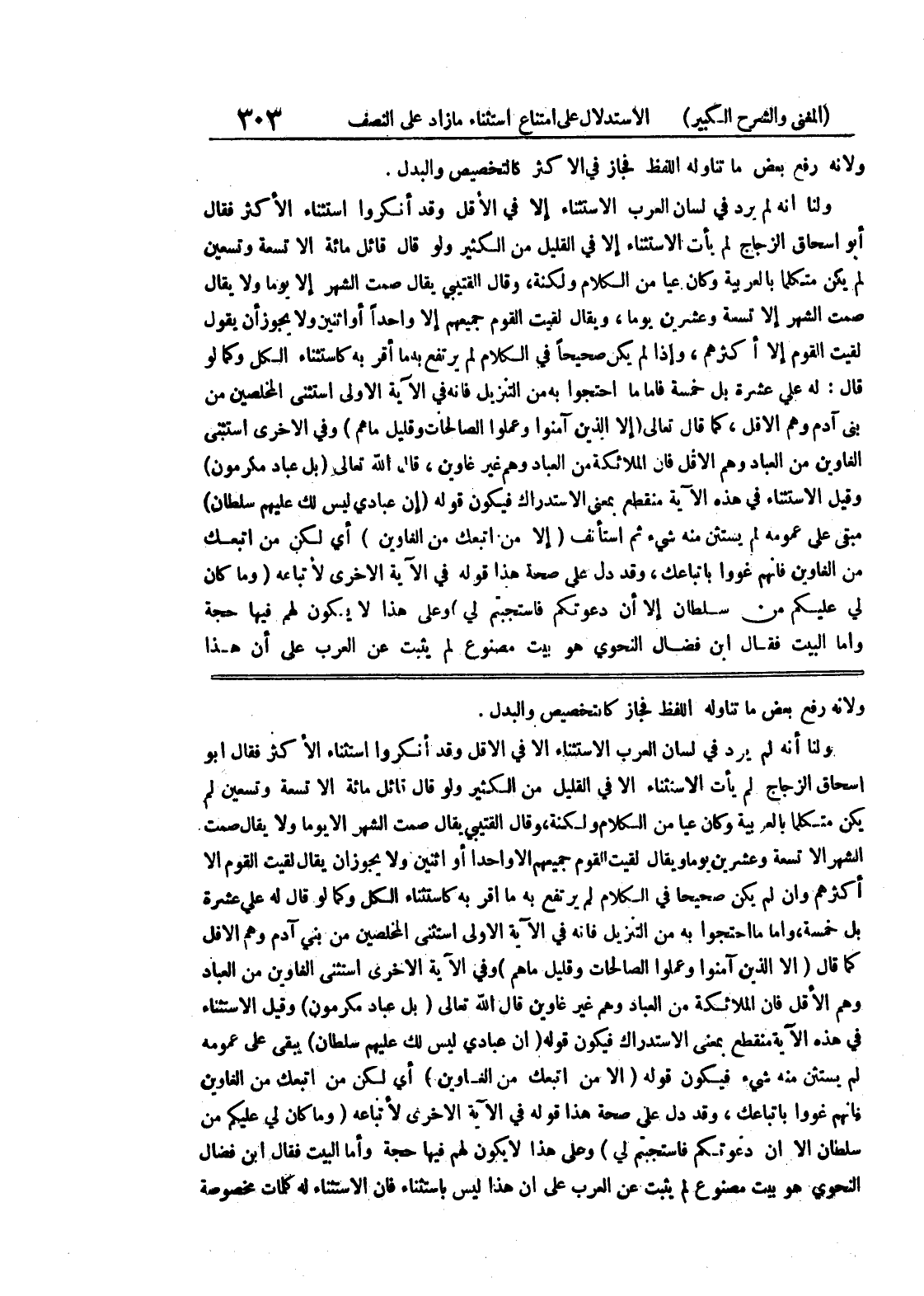إسحاق الزجاج لم يأت الاستثناء إلا في القليل من الكثير ولو قال قائل مائة إلا تسعة وتسعين لم يكن متكلماً بالعربية وكان عياً من الكلام ولكنة، وقال القتيبي يقال صمت الشهر إلا يوماً ولا يقال صمت الشهر إلا تسعة وعشرين يوماً ويقال لقيت القوم جميعهم إلا واحداً أو اثنين ولا يجوزان يقال لقيت القوم إلا أكثرهم وإن لم يكن صحيحاً في الكلام لم يرتفع به ما أقر به كاستثناء الكل وكما لو قال له علي عشرة بل خسمة، وأما ما احتجوا به من التزيل فإنه في الآية الأولى استثنى المخلصين من بني آدم وهم الافل كما قال (إلا الذين آمنوا وعملوا الصلحات وقليل ماهم) وفي الآية الأخرى استثنى الغاوين من العباد وهم الأقل فإن الملائكة من العباد وهم غير غاوين قال الله تعالى (بل عباد مكرمون) وقيل الاستثناء في هذه الآية منقطع بمعنى الاستدراك فيكون قوله (إن عبادي ليس لك عليهم سلطان) يبقى على عمومه لم يستثن منه شئ فيكون قوله (إلا من اتبعك من الغاوين) أي لكن من ابتعك من الغاوين فإنهم غووا باتباعك، وقد دل على صحة هذا قوله في الآية الأخرى لاتباعه (وما كان لي عليكم من سلطان إلا أن دعوتكم فاستجبتم لي) وعلى هذا لا يكون لهم فيها حجة وأما البيت فقال ابن فضال النحوي هو بيت مصنوع لم يثبت عن العرب على أن هذا ليس باستثناء فإن الاستثناء له كلمات مخصوصة