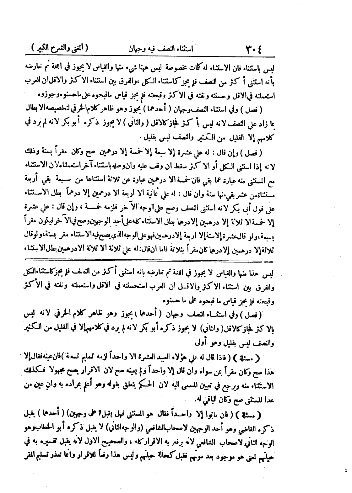 ليس هذا منها والقياس لا يجوز في اللغة ثم نعارضه بأنه استثنى أكثر من النصف فلم يجز كاستثناء الكل والفرق بين استثناء الأكثر والأقل أن العرب استحسنته في الأقل واستعملته ونفته في الأكثر وقبحته فلم يجز قياس ما قبحوه على ما حسنوه (فصل) وفي استثناء النصف وجهان (أحدهما) يجوز وهو ظاهر كلام الخرقي لأنه ليس بالأكثر فجاز كالأقل (والثاني) لا يجوز ذكره أبو بكر لأنه لم يرد في كلامهم إلا في القليل من الكثير والنصف ليس بقليل وهو أولى (مسألة) (فإذا قال له على هولاء العبيد العشرة إلا واحداً لزمه تسليم تسعة) فإن عينه فقال إلا هذا صح وكان مقراً بمن سواه وإن قال إلا واحداً ولم يعينه صح لأن الإقرار يصح مجهولاً فكذلك الاستثناء منه ويرجع في تعيين المسمى إليه لأن الحكم يتعلق بقوله وهو أعلم بمراده به وإن عين من