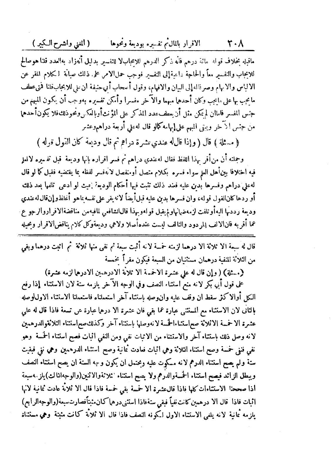 قال له سبعة الا ثلاثة الادرهما لزمته خمسة لأنه أثبت سبعة ثم نفى منها ثلاثة ثم أثبت درهماً وبقي من الثلاثة المنفية درهمان مستثنيان من السبعة فيكون مقراً بخمسة (مسألة) (وإن قال له علي عشرة إلا خمسة إلا ثلاثة الادرهمين الادرهما لزمه عشرة) على قول أبي بكر لأنه منع استثناء النصف وفي الوجه الآخر يلزمه ستة لأن الاستثناء إذا رفع الكل أو الا كثر سقط إن وقف عليه وإن وصله باستثناء آخر استعملناه فاستعملنا الاستثناء الأول لوصله بالثاني لأن الاستثناء مع المستثنى عبارة عما بقي فان عشرة الادرهما عبارة عن تسعة فإذا قال له على عشرة إلا خمسة إلا ثلاثة صح استثناء الخمسة لأنه وصلها باستثناء آخر وكذلك صح استثناء الثلاثة والدرهمين لأنه وصل ذلك باستثناء آخر والاستثناء من الاثبات نفي ومن النفي اثبات فصح استثناء الخمسة وهو نفي فنفي خسمة وصح استثناء الثلاثة وهي إثبات فعادت ثمانية وصح استثناء الدرهمين وهي نفي فبقيت ستة ولم يصح استثناء الدرهم لأنه مسكوت عليه ويحتمل أن يكون وجه الستة أن يصح استثناء النصف ويبطل الزائد فيصح استثناء الخمسة والدرهم ولا يصح استثناء ثلاثة والاثنين (والوجه الثالث) يلزمه سبعة إذا صححنا الاستثناءات كلها فإذا قال عشرة إلا خمسة بقي خمسة فإذا قال إلا ثلاثة عادت ثمانية لأنها إثبات فإذا قال إلا درهمين كانت نفياً فبقي ستة فإذا استثنى درهما كان مثبتاً فصارت سبعة (والوجه الرابع) يلزمه ثمانية لأنه يلغي الاستثناء الأول لكونه النصف فإذا قال إلا ثلاثة كانت مثبتة وهي مستثناة