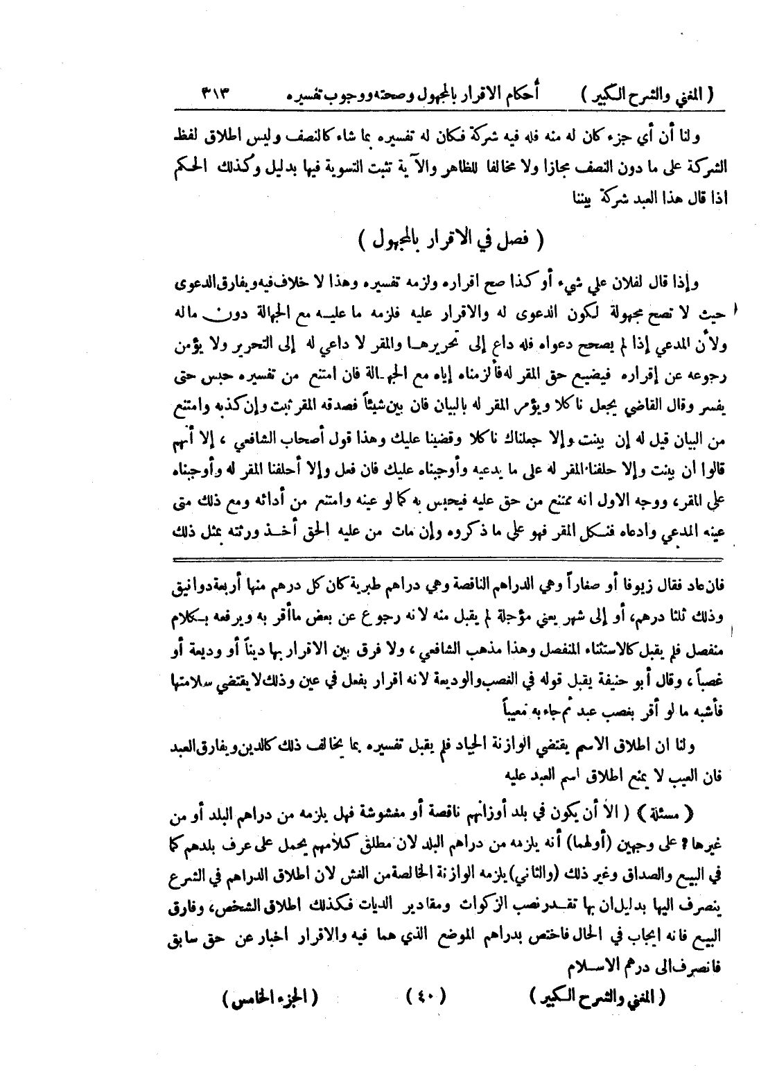 فان عاد فقال زيوفا أو صغار أو هي الدراهم الناقصة وهي دراهم طبرية كان كل درهم منها أربعة دوانيق وذلك ثلثا درهم، أو الى شهر يعني مؤجلة لم يقبل منه لأنه رجوع عن بعض ما أقربه ويرفعه بكلام منفصل فلم يقبل كالاستثناء المفنصل وهذا مذهب الشافعي، ولا فرق بين الإقرار بها ديناً أو وديعة أو غصباً، وقال أبو حنيفة يقبل قوله في الغصب والوديعة لأنه إقرار بفعل في عين وذلك لا يقتضي سلامتها فأشبه مالو أقر بغصب عبد ثم جاء به معيباً ولنا أن إطلاق الاسم يقتضي الوازنة الجياد فلم يقبل تفسيره بما يخالف ذلك كالدين ويفارق العبد فإن العيب لايمنع إطلاق اسم العبد عليه (مسألة) (إلا أن يكون في بلد أوزانهم ناقصة أو مغشوشة فهل يلزمه من دراهم البلد أو من غيرها؟ على وجهين (أولهما) أنه يلزمه من دراهم البلد لأن مطلق كلامهم يحمل على عرف بلدهم كما