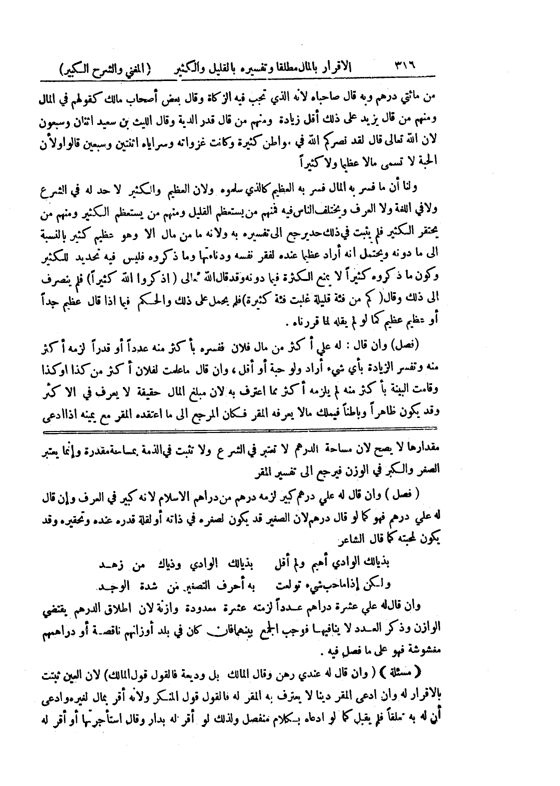مقدارها لا يصح لأن مساحة الدرهم لا تعتبر في الشرع ولا يثبت في الذمة بمساحة مقدرة وإنما يعتبر الصغر والكبر في الوزن فيرجع إلى تفسير المقر (فصل) وإن قال له علي درهم كبير لزمه درهم من دراهم الإسلام لأنه كبير في العرف وإن قال له على درهم فهو كما لو قال درهم لأن الصغير قد يكون لصغره في ذاته أو لقلة قدره عنده وتحقيره وقد يكون لمحبته كما قال الشاعر بذيالك الوادي أهيم ولم أقل بذيالك الوادي وذياك من زهد ولكن إذا ماحب شئ تولعت به أحرف التصغير من شدة الوجد وإن قال له على عشرة دراهم عدداً لزمته عشرة معدودة وازنة لأن إطلاق الدرهم يقتضي الوازن وذكر العدد لا ينافيها فوجب الجمع بينهما فإن كان في بلد أو زانهم ناقصة أو دراهمم مغشوشة فهو على ما فصل فيه.