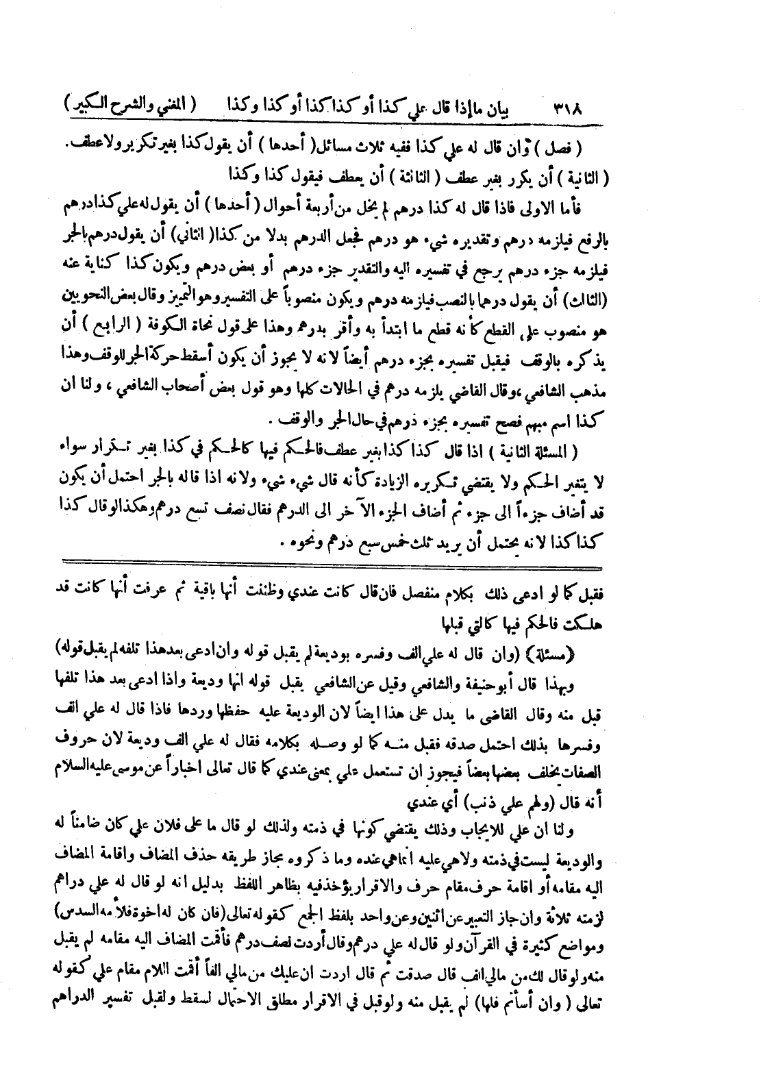 وفسرها بذلك احتمل صدقه فقبل منه كما لو وصله بكلامه فقال له على ألف وديعة لأن حروف الصفات يخلف بعضها بعضاً فيجوز أن تستعمل علي بمعنى عندي كما قال تعالى إخباراً عن موسى عليه السلام أنه قال (ولهم علي ذنب) أي عندي ولنا أن على للإيجاب وذلك يقتضي كونها في ذمته ولذلك لو قال ما على فلان علي كان ضامناً له والوديعة ليست في ذمته ولاهي عليه إنما هي عنده وما ذكروه مجاز طريقه حذف المضاف وإقامة المضاف إليه مقامه أو إقامة حرف مقام حرف والإقرار يؤخذ فيه بظاهر اللفظ بدليل أنه لو قال له على دراهم لزمته ثلاثة وإن جاز التعبير عن اثنين وعن واحد بلفظ الجمع كقوله تعالى (فإن كان له إخوة فلأمه السدس) ومواضع كثيرة في القرآن ولو قال له على درهم وقال أردت نصف درهم فأقمت المضاف إليه مقامه لم يقبل منه ولو قال لك من مالي ألف قال صدقت ثم قال أردت أن عليك من مالي ألفاً أقمت اللام مقام على كقوله تعالى (وإن أسأتم فلها) لم يقبل منه ولو قبل في الإقرار مطلق الاحتمال لسقط ولقبل تفسير الدراهم