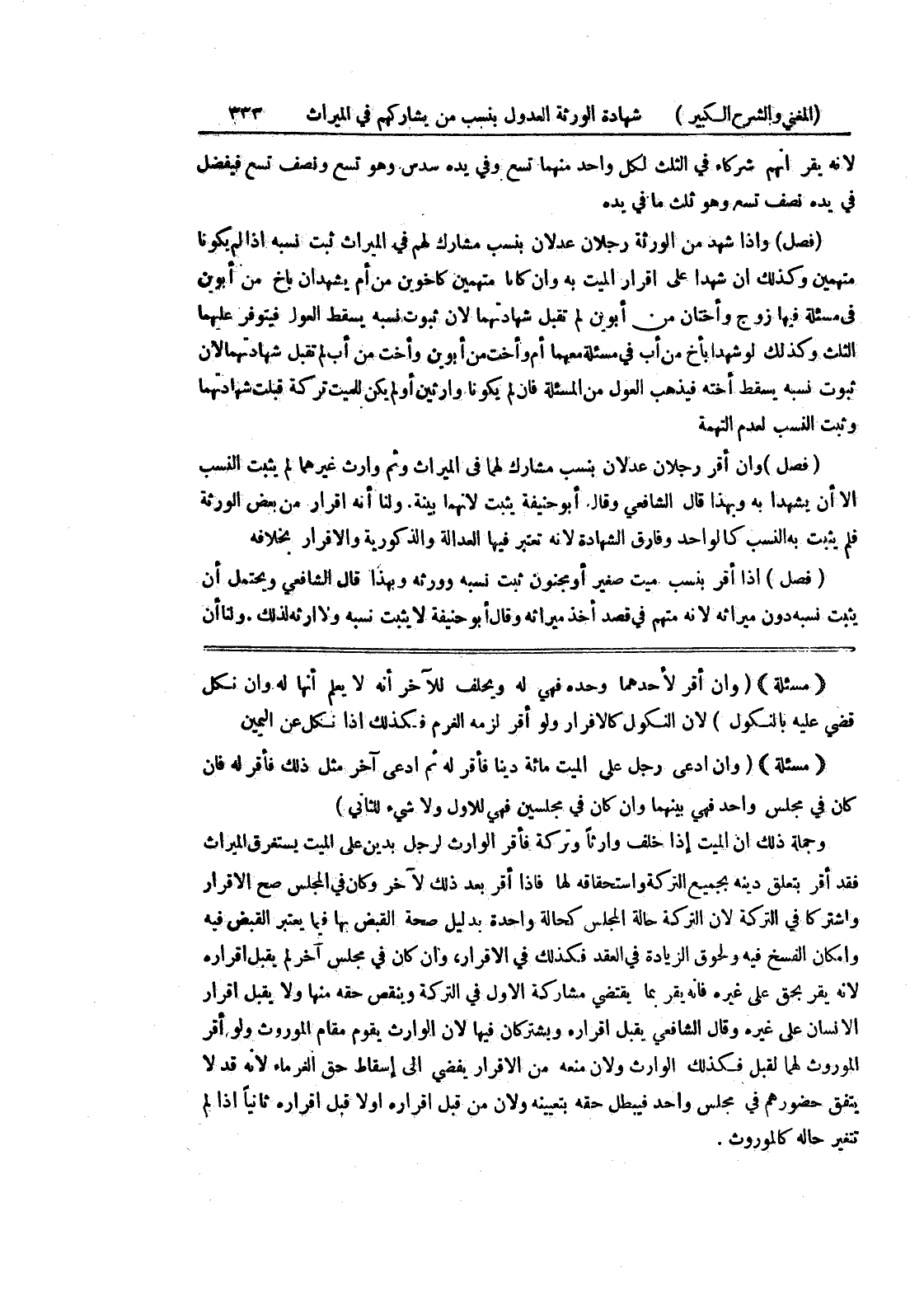 (مسألة) (وإن ادعى رجل على الميت مائة دينا فأقر له ثم ادعى آخر مثل ذلك فأقر له فان كان في مجلس واحد فهي بينهما وإن كان في مجلسين فهي للأول ولا شئ للثاني) وجملة ذلك أن الميت إذا خلف وارثاً وتركة فأقر الوارث لرجل بدين على الميت يستغرق الميراث فقد أقر بتعلق دينه بجميع التركة واستحقاقه لها فإذا اقر بعد ذلك لآخر وكان في المجلس صح الإقرار واشتركا في التركة لأن التركة حالة المجلس كحالة واحدة بدليل صحة القبض بها فيما يعتبر القبض فيه وإمكان الفسخ فيه ولحقوق الزيادة في العقد فكذلك في الإقرار، وإن كان في مجلس آخر لم يقبل إقراره لأنه يقر بحق على غيره فإنه يقر بما يقتضي مشاركة الأول في التركة وينقص حقه منها ولا يقبل اقرار الإنسان على غيره وقال الشافعي يقبل إقراره ويشتركان فيها لأن الوارث يقوم مقام الموروث ولو أقر الموروث لهما لقبل فكذلك الوارث ولأن منعه من الإقرار يفضي الى اسقاط حق الغرماء لأنه قد لا يتفق حضورهم في مجلس واحد فيبطل حقه بتعيينه ولأن من قبل اقراره اولا قبل إقراره ثانياً إذا لم تتغير حاله كالموروث.