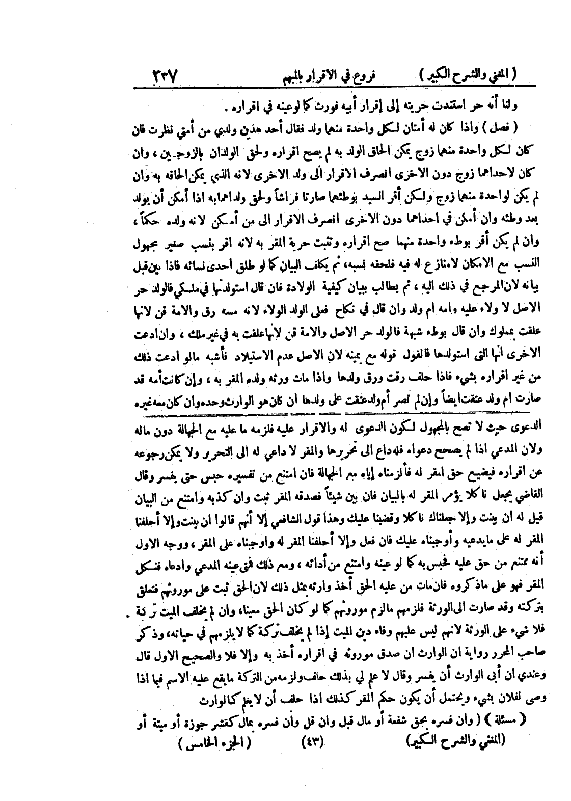الدعوى حيث لا تصح بالمجهول لكون الدعوى له والإقرار عليه فلزمه ما عليه مع الجهالة دون ماله ولأن المدعي اذا لم يصحح دعواه فله داع إلى تحريرها والمقر لا داعي له إلى التحرير ولا يمكن رجوعه عن إقراره فيضيع حق المقر له فألزمناه إياه مع الجهالة فإن امتنع من تفسيره حبس حتى يفسر وقال القاضي يجعل ناكلا يؤمر المقر له بالبيان فإن بين شيئاً فصدقه المقر ثبت وإن كذبه وامتنع من البيان قيل له إن بينت وإلا جعلناك ناكلا وقضينا عليك وهذا قول الشافعي إلا أنهم قالوا إن بنت وإلا أحلفنا المقر له على ما يدعيه وأو جبناه عليك فإن فعل وإلا أحلفنا المقر له وأوجبناه على المقر، ووجه الأول أنه ممتنع من حق عليه فحبس به كما لوعينه وامتنع من أدائه، ومع ذلك فمتى عينه المدعي وادعاه فنكل المقر فهو على ما ذكروه فإن مات من عليه الحق أخذ وارثه بمثل ذلك لأن الحق ثبت على موروثهم فتعلق بتركته وقد صارت إلى الورثة فلزمهم ما لزم موروثهم كما لو كان الحق معينا، وإن لم يخلف الميت تركة.