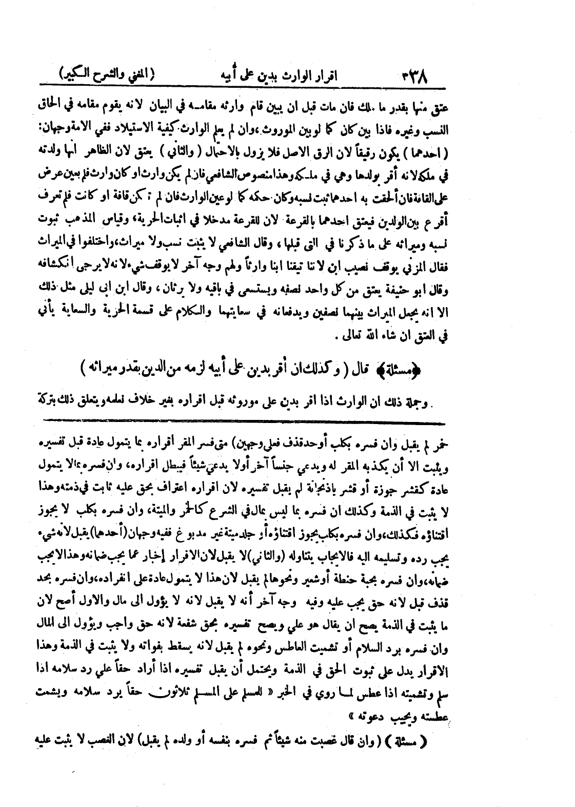 خمر لم يقبل وإن فسره بكلب أو حد قذف فعلى وجهين) متى فسر المقر إقراره بما يتمول عادة قبل تفسيره ويثبت إلا أن يكذبه المقر له ويدعي جنسا آخر أولا يدعي شيئاً فيبطل إقراره، وإن فسره بمالا يتمول عادة كقشر جوزة أو قشر باذنجانة لم يقبل تفسيره لأن إقراره اعترف بحق عليه ثابت في ذمته وهذا لا يثبت في الذمة وكذلك أن فسره بما ليس بمال في الشرع كالخمر والميتة، وإن فسره بكلب لا يجوز اقتناؤه فكذلك، وإن فسره بكلب يجوز اقتناؤه أو جلد ميتة غير مدبوغ ففيه وجهان (أحدهما) يقبل لأنه شئ يجب رده وتسليمه إليه فالإيجاب يتناوله (والثاني) لا يقبل لأن الإقرار إخبار عما يجب ضمانه وهذا لا يجب ضمانه، وإن فسره بحبة حنطة أو شعير ونحوها لم يقبل لأنه هذا لا يتمول عادة على انفراده، وإن فسره بحد قذف قبل لأنه حق يجب عليه وفيه وجه آخر أنه لا يقبل لأنه لا يؤول إلى مال والأول أصح لأن ما يثبت في الذمة يصح أن يقال هو علي ويصح تفسيره بحق شفعة لأنه حق واجب ويؤول إلى المال وإن فسره برد السلام أو تشميت العاطس ونحوه لم يقبل لأنه يسقط بفواته ولا يثبت في الذمة وهذا الإقرار يدل على ثبوت الحق في الذمة ويحتمل أن يقبل تفسيره إذا أراد حقاً علي رد سلامه إذا سلم وتشميته إذا عطس لما روي في الخبر (للمسلم على المسلم ثلاثون حقاً يرد سلامه ويشمت عطسته ويجب دعوته) (مسألة) (وإن قال غصبت منه شيئاً ثم فسره بنفسه أو ولده لم يقبل) لأن الغصب لا يثبت عليه