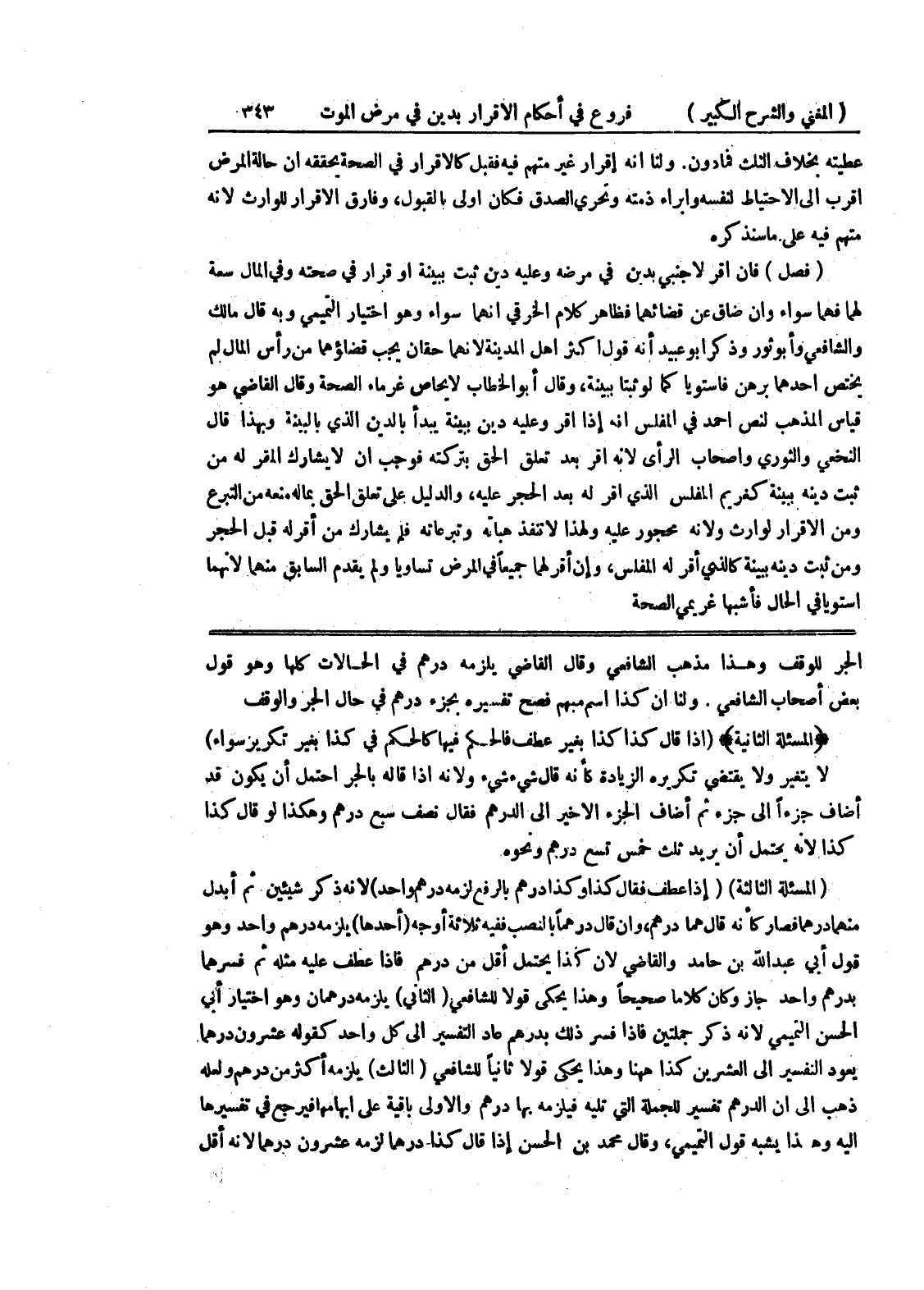 ولنا أن كذا اسم مبهم فصح تفسيره بجزء درهم في حال الجر والوقف (المسألة الثانية) (إذا قال كذا كذا بغير عطف فالحكم فيها كالحكم في كذا بغير تكرير سواء) لا يتغير ولا يقتضي تكريره الزيادة كأنه قال شئ مشئ ولأنه إذا قاله بالجر احتمل أن يكون قد أضاف جزءاً إلى جزء ثم أضاف الجزء الأخير إلى الدرهم فقال نصف سبع درهم وهكذا لو قال كذا كذا لأنه يحتمل أن يرد ثلث خمس تسع درهم ونحوه (المسألة الثالثة) (إذا عطف فقال كذاوكذا درهم بالرفع لزمه درهم واحد) لأنه ذكر شيئين ثم أبدل منهما درهماً فصار كأنه قال هما درهم، وإن قال درهماً بالنصب ففيه ثلاثة أوجه (أحدها) يلزمه درهم واحد وهو قول أبي عبد الله بن حامد والقاضي لأن كذا يحتمل أقل من درهم فإذا عطف عليه مثله ثم فسرهما بدرهم واحد جاز وكان كلاماً صحيحاً وهذا يحكي قولاً للشافعي (الثاني) يلزمه درهمان وهو اختيار أبي الحسن التميمي لأنه ذكر جملتين فإذا فسر ذلك بدرهم عاد التفسير إلى كل واحد كقوله عشرون درهماً يعود النفسير إلى العشرين كذا ههنا وهذا يحكي قولا ثابنا للشافعي (الثالث) يلزمه أكثر من درهم ولعله