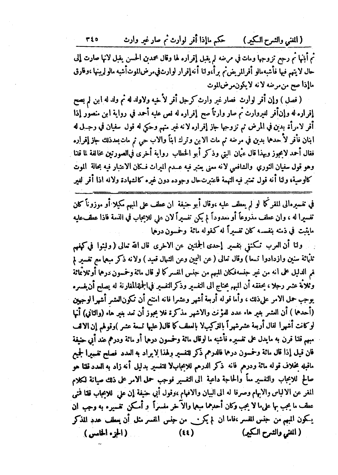 في تفسيره إلى المقر كما لو لم يعطف عليه، وقال أبو حنيفة إن عطف على المبهم مكيلا أو موزونا كان تفسيراً له، وإن عطف مذروعاً أو معدوداً لم يكن تفسيراً لأن علي للإيجاب في الذمة فإذا عطف عليه ما يثبت في ذمته بنفسه كان تفسيراً له كقوله مائة وخمسون درهماً ولنا أن العرب تكتفي بتفسير إحدى الجملتين عن الأخرى قال الله تعالى (ولبثوا في كهفهم