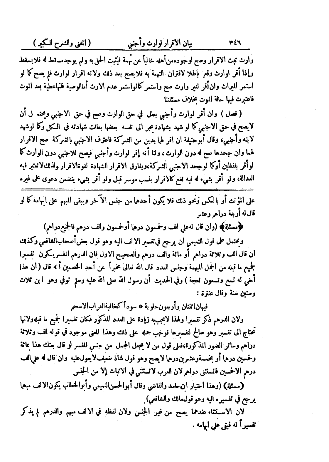 فيهان إثنتان وأربعون حلوبة * سودا كخافية العراب الأسحم ولأن الدرهم ذكر تفسيراً ولهذا لا يجب به زيادة على العدد المذكور فكان تفسيراً لجميع ما قبله ولأنها تحتاج إلى تفسير وهو صالح لتفسيرها فوجب جمله على ذلك وهذا المعنى موجود في قوله ألف وثلاثة دراهم وسائر الصور المذكورة، فعلى قول من لا يجعل المجمل من جنس المفسر لو قال بعتك هذا بمائة وخمسين درهماً أو بخمسة وعشرين درهماً لا يصح وهو قول شاذ ضعيف لا يعول عليه وإن قال له على ألف درهم إلا خمسين فالمستثنى دراهم لأن العرب لا تستثني في الإثبات إلا من الجنس (مسألة) (وهذا اختيار ابن حامد والقاضي وقال أبو الحسن التميمي وأبو الخطاب يكون الألف مبهماً يرجع في تفسيره إليه وهو قول مالك والشافعي) لأن الاستثناء عندهما يصح من غير الجنس ولأن لفظه في الألف مبهم والدرهم لم يذكر تفسيراً له فبقي على إبهامه.