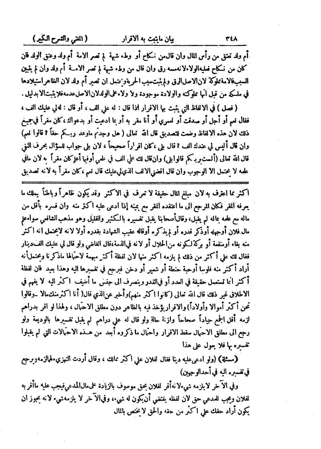 أكثر مما اعترف به لأن مبلغ المال حقيقة لا تعرف في الأكثر وقد يكون ظاهراً وباطنا يملك ما يعرفه المقر فكان المرجع إلى ما اعتقده المقر مع يمينه إذا ادعى عليه أكثر منه وان فسره بأقل من ماله مع علمه بماله لم يقبل، وقال أصحابنا يقبل تفسيره بالكثير والقليل وهو مذهب الشافعي سواء علم مال فلان أو جهله أو ذكر قدره أولم يذكره أو قاله عقيب الشهادة بقدره أولاً لأنه لا يحتمل أنه أكثر منه بقاء أو منفعة أو بركة لكونه من الحلال أو لأنه في الذمة، قال القاضي ولو قال لي عليك ألف دينار فقال لك على أكثر من ذلك لم يلزمه أكثر منها لأن لفظة أكثر مبهمة لإحتمالها ما ذكرنا ويحتمل أنه أراد أكثر منه فلوساً أو حبة حنطة أو شعير أو دخن فيرجع في تفسيرها إليه وهذا بعيد فإن لفظة أكثر إنما تستعمل حقيقة في العدد أو في القدر وينصرف إلى جنس ما أضيف أكثر إليه لا يفهم في الإطلاق غير ذلك قال الله تعالى (كانوا أكثر منهم) وأخبر عن الذي قال (أنا أكثر منك مالا وقالوا نحن أكثر أموالا وأولادا) والإقرار يؤخذ فيه بالظاهر دون مطلق الاحتمال، ولهذا لو أقر بدراهم لزمه أقل الجمع جيادا صحاحاً وازنة حاله ولو قال له على دراهم لم يقبل تفسيرها بالوديعة ولو رجع إلى مطل الإحتمال سقط الإقرار وإحتمال ما ذكروه أبعد من هذه الإحتمالات التي لم يقبلوا تفسيره بها فلا يعول على هذا (مسألة) (ولو ادعى عليه ينا فقال لفلان علي اكثر ممالك، وقال أردت التهزئ لهما لزمه ويرجع