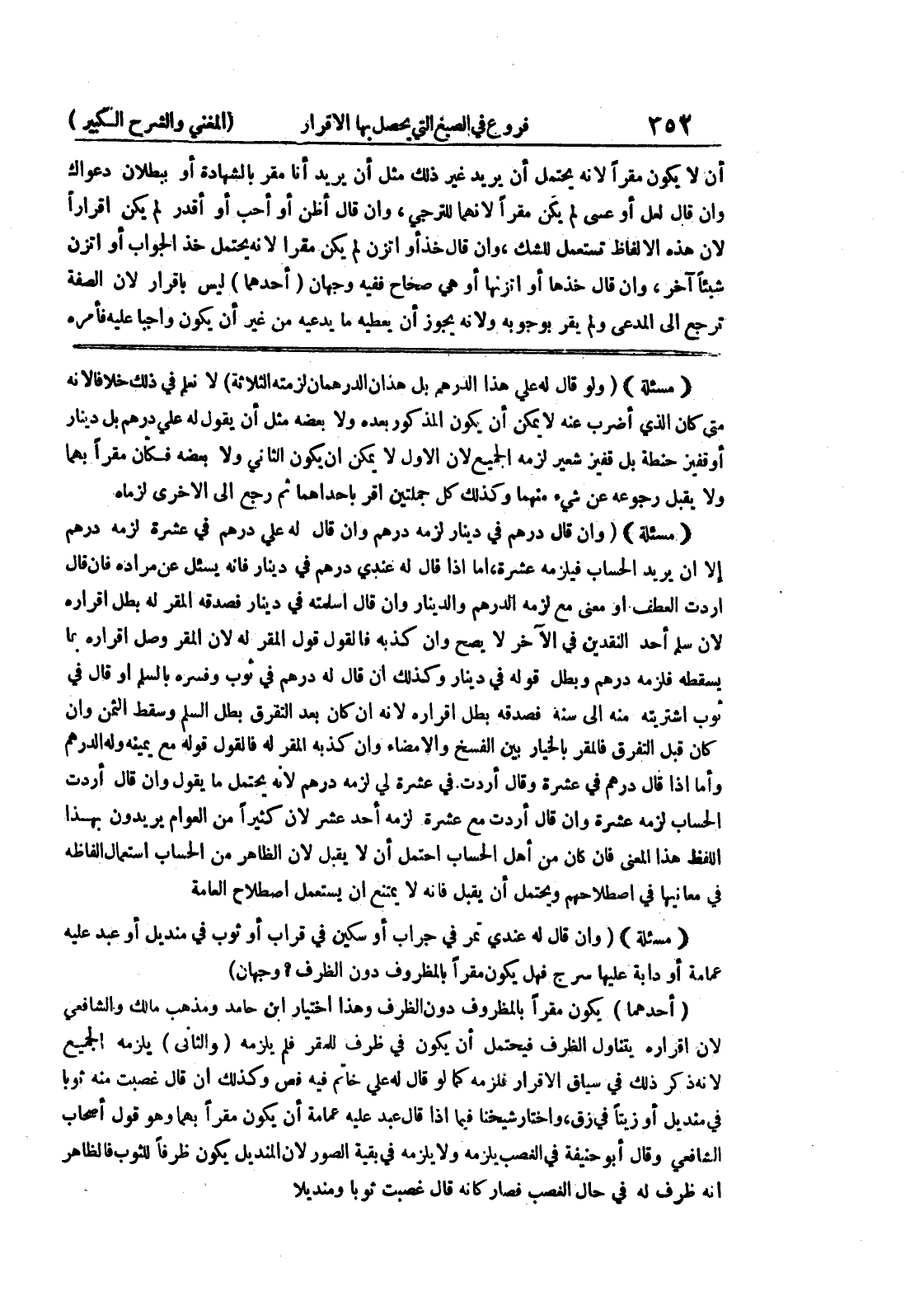 (مسألة) (وإن قال درهم في دينار لزمه درهم وإن قال له على درهم في عشرة لزمه درهم إلا أن يريد الحساب فيلزمه عشرة، أما إذا قال له عندي درهم في دينار فإنه يسئل عن مراده فإن قال أردت العطف أو معنى مع لزمه الدرهم والدينار وإن قال أسلمته في دينار فصدقة المقر له بطل إقراره لأن سلم أحد النقدين في الآخر لا يصح وإن كذبه فالقول قول المقر له لأن المقر وصل إقراره بما يسقطه فلزمه درهم وبطل قوله في دينار وكذلك إن قال له درهم في ثوب وفسره بالسلم أو قال في ثوب إشتريته منه إلى سنة فصدقه بطل إقراره لأنه إن كان بعد التفرق بطل السلم وسقط الثمن وإن كان قبل التفرق فالمقر بالخيار بين الفسخ والإمضاء وإن كذبه المقر له فالقول قوله مع يمينه وله الدرهم وأما اذا قال درهم في عشرة وقال أردت في عشرة لي لزمه درهم لأنه يحتمل ما يقول وإن قال أردت الحساب لزمه عشرة وإن قال أردت مع عشرة لزمه أحد عشر لأن كثيراً من العوام يريدون بهذا اللفظ هذا المعنى فإن كان من أهل الحساب احتمل أن لا يقبل لأن الظاهر من الحساب إستعمال ألفاظه في معاينها في إصطلاحهم ويحتمل أن يقبل فإنه لا يمتنع أن يستعمل إصطلاح العامة (مسألة) (وإن قال هل عندي تمر في جراب أو سكين في قراب أو ثوب في منديل أو عبد عليه عمامة أو دابة عليها سرج فهل يكون مقراً بالمظروف دون الظرف؟ وجهان) (أحدهما) يكون مقراً بالمظروف دون الظرف وهذا اختيار ابن حامد ومذهب مالك والشافعي لأن إقراره يتناول الظرف فيحتمل أن يكون في ظرف للمقر فلم يلزمه (والثاني) يلزمه الجميع لأنه ذكر ذلك في سياق الإقرار فلزمه كما لو قال له علي خاتم فيه فص وكذلك إن قال غصبت منه ثوبا في منديل أو زيتاً في زق، وإختار شيخنا فيما إذا قال عبد عليه عمامة أن يكون مقراً بهما وهو قول أصحاب الشافعي وقال أبو حنيفة في الغصب يلزمه ولا يلزمه في بقية الصور لأن المنديل يكون ظرفاً للثوب فالظاهر أنه ظرف له في حال الغصب فصار كأنه قال غصبت ثوباً ومنديلا