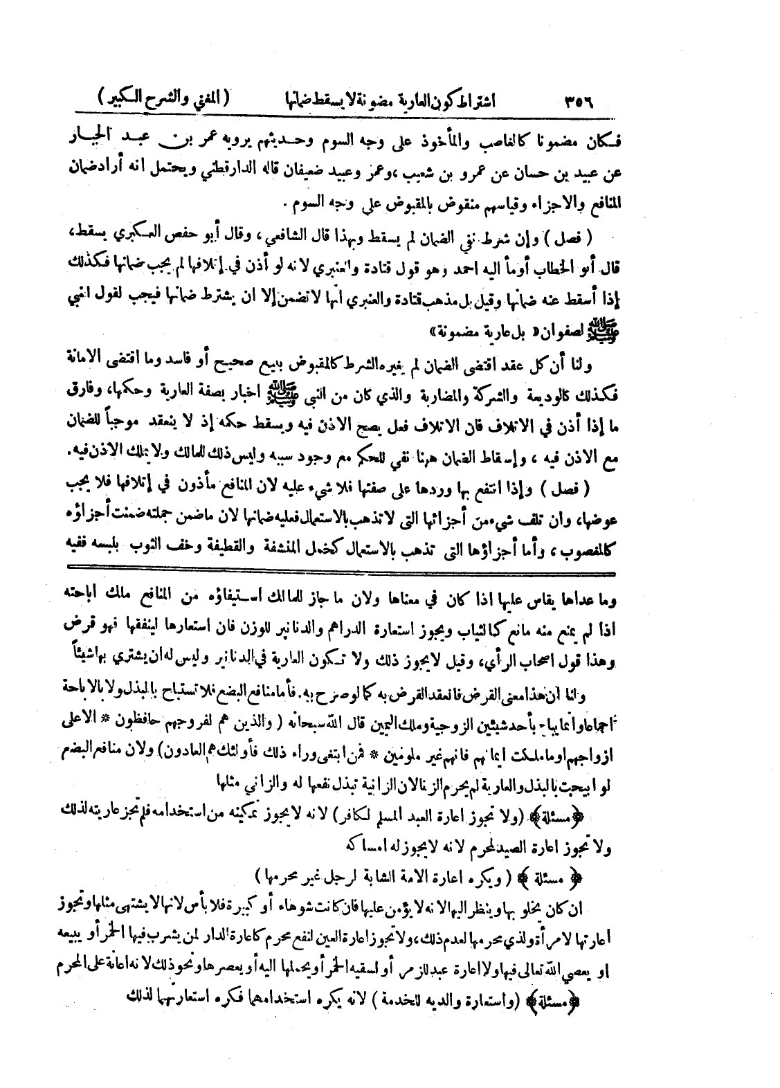 وهذا قول أصحاب الرأي، وقيل لا يجوز ذلك ولا تكون العارية في الدنانير وليس له أن يشتري بها شيئاً ولنا أن هذا معنى القرض فانعقد القرض به كما لو صرح به فأما منافع البضع فلا تستباح بالبذل ولا بالإباحة إجماعاً وإنما يباح بأحد شيئين الزوجية وملك اليمين قال الله سبحانه (والذين هم لفروجهم حافظهون * الاعلى أزواجهم أو ما ملكت أيمانهم فإنهم غير ملومين * فمن ابتغى وراء ذلك فأولئك هم العادون) ولأن منافع البضع لو ابيجت بالبذل والعارية لم يحرم الزنا لأن الزانية تبذل نفعها له والزاني مثلها (مسألة) (ولا تجوز إعارة العبد المسلم لكافر) لأنه لا يجوز تمكينه من استخدامه فلم تجز عاريته لذلك ولا تجوز إعارة الصيد لمحرم لأنه لا يجوز له إمساكه (مسألة) (ويكره إعارة الأمة الشابة لرجل غير محرمها) إن كان يخلو بها وينظر إليها لأنه لا يؤمن عليها فإن كانت شوهاء أو كبيرة فلا بأس لأنها لا يشتهى مثلها وتجوز إعارتها لامرأة ولذي محرمها لعدم ذلك، ولا تجوز إعارة العين لنفع محرم كاعارة الدر لمن يشرب فيها الخمر أو يبيعه أو يعصي الله تعالى فيها أو لااعارة عبد للزمر أو لسقيه الخمر أو يحملها إليه أو يعصرها ونحو ذلك لأنه إعانة على المحرم (مسألة) (واستعارة والديه للخدمة) لأنه يكره استخدامهما فكر استعارتهما لذلك