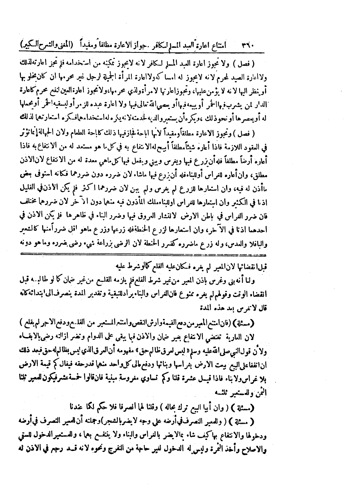 الثمن وللمستعير ثلثه (مسألة) (وإن أبيا البيع ترك بحاله) وقلنا لهما انصرفا فلا حكم لكما عندنا (مسألة) (وللمعير النصرف في أرضه على وجه لا يضر بالشجر) وجملته أن للمعير التصرف في أرضه (مسألة) ودخولها والإنتفاع بها كيف شاء بما لا يضر بالغراس والبناء ولا ينتفع بهما، وللمتسعير الدخول للسقي والإصلاح وأخذ الثمرة وليس.