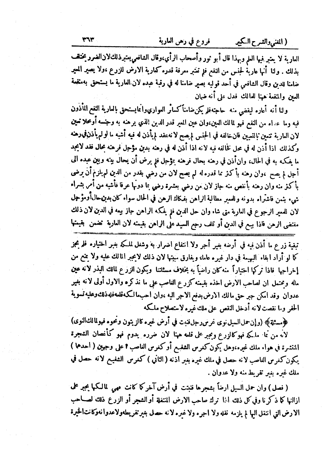 تبقية زرع ما أذن فيه في أرضه بغير أجر ولا انتفاع إضرار به وشغل لملكه بغير اختياره فلم يجز كما لو أراد إبقاء البهيمة في دار غيره عاماً، ويفارق مبيتها لأن ذلك لا يجبر المالك عليه ولا يمنع من إخراجها فإذا تركها اختياراً منه كان راضياً به بخلاف مسئلتنا ويكون الزرع لمالك البذر لأنه عين ماله ويحتمل أن لصاحب الأرض أخذه بقيمته كزرع الغاصب على ما نذكره والأول أولى لأنه بغير عدوان وقد أمكن جبر حق مالك الأرض بدفع الأجر إليه، وإن احب مالكه قعله فله ذلك وعليه تسوية الحفر وما نقصت لأنه أدخل النقص على ملك غيره لا ستصلاح ملكه (مسألة) (وإن حمل السيل نوى غرس رجل فنبت في أرض غيره كالزيتون ونحوه فهو لمالك النوى) لأنه من نماء ملكه فهو كالزرع ويجبر على قلعه ههنا لأن ضرره يدوم فهو كأغصان الشجرة المنتشرة في هواء ملك غيره، وهل يكون كغرس الشفع أو كغرس الغاصب؟ على وجهين (أحدهما)