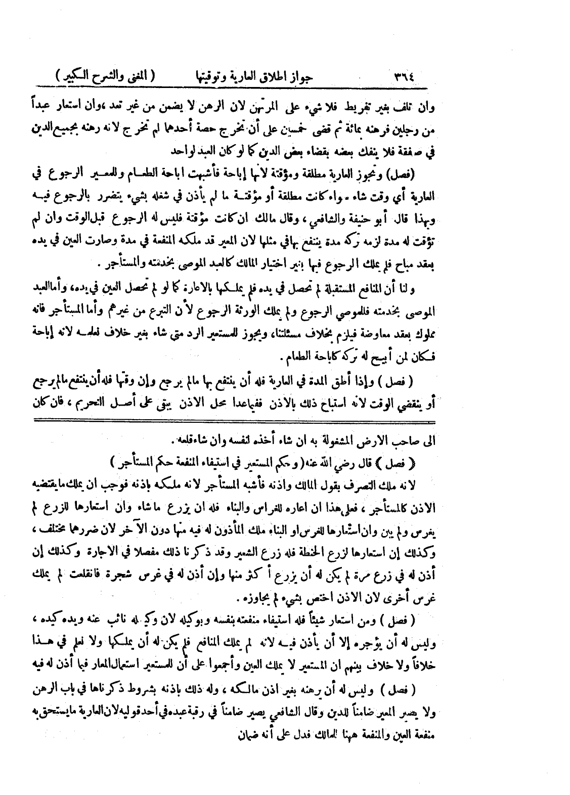 (فصل) ومن استعار شيئاً فله استيفاء منفعته بنفسه وبوكيله لأن وكيله نائب عنه ويده كيده، وليس له أن يؤجره إلا أن يأذن فيه لأنه لم يملك المنافع فلم يكن له أن يملكها ولا نعلم في هذا خلافاً ولا خلاف بينهم أن المستعير لا يملك العين وأجمعوا على ان للمستعير استعمال المعار فيما أذن له فيه (فصل) وليس له أن يرهنه بغير إذن مالكه، وله ذلك باذنه بشروط ذكرناها في باب الرهن ولا يصير المعير ضامناً للدين وقال الشافعي يصير ضامناً في رقبة عبده في أحد قوليه لأن العارية ما يستحق به منعفة العين والمنفعة ههنا للمالك فدل على أنه ضمان