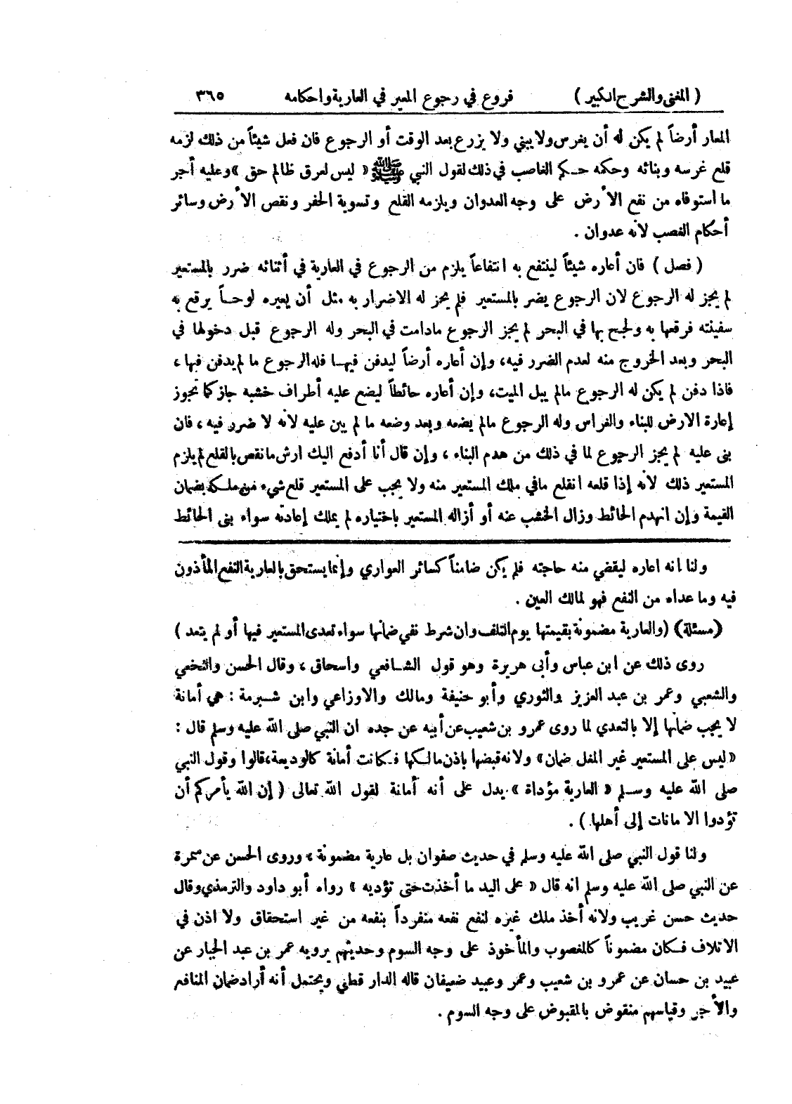 ولنا قول النبي صلى الله عليه وسلم في حديث صفوان بل عارية مضمونة، وروى الحسن عن سمرة عن النبي صلى الله عليه وسلم أنه قال (على اليد ما أخذت حتى تؤديه) رواه أبو داود والترمذي وقال حديث حسن غريب ولأنه أخذ ملك غيره لنفع نفعه منفرداً بنفعه من غير استحقاق ولا إذن في الإتلاف فكان مضموناً كالمغصوب والمأخوذ على وجه السوم وحديثهم يرويه عمر بن عبد الجبار عن عبيد بن حسان عن عمرو بن شعيب وعمر وعيبد ضعيفان قاله الدار قطعي ويحتمل أنه أراد ضمان المنافع والأجر وقياسهم منقوض بالمقبوض على وجه السوم.
