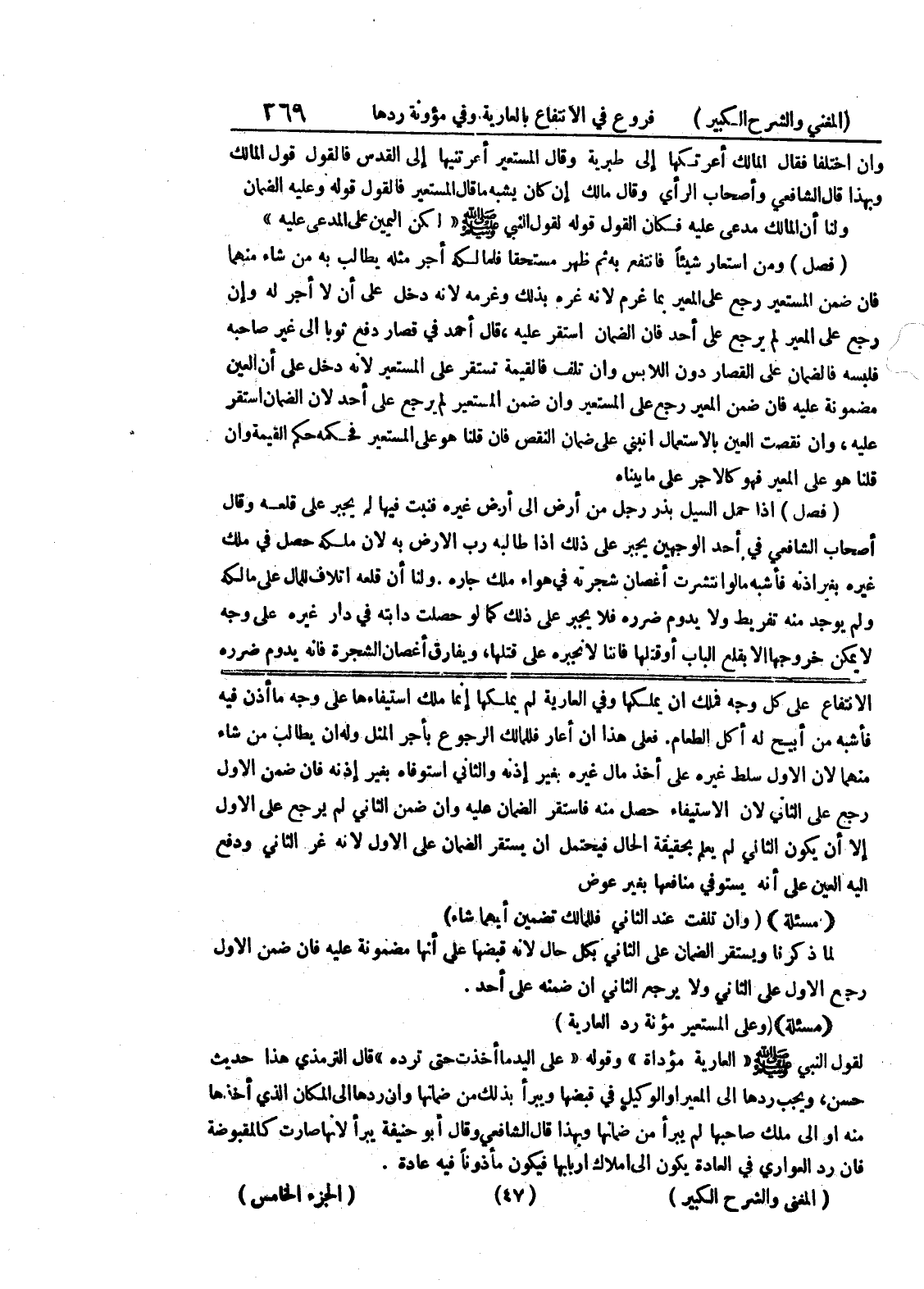 (مسألة) (وإن تلفت عند الثاني فللمالك تضمين أيهما شاء) لما ذكرنا ويستقر الضمان على الثاني بكل حال لأنه قبضها على أنها مضمونة عليه فإن ضمن الأول رجع الأول على الثاني ولا يرجع الثاني إن ضمنه على أحد (مسألة) (وعلى المستعير مؤنة رد العارية) لقول النبي صلى الله عليه وسلم (العارية مؤداة) وقوله (على اليد ما أخذت حتى ترده) قال الترمذي هذا حديث حسن، ويجب ردها إلى المعير أو الوكيل في قبضها ويبرأ بذلك من ضمانها وإن ردها الى المكان الذي أخذها منه أو الى ملك صاحبها لم يبرأ من ضمانها وبهذا قال الشافعي وقال أبو حنيفة يبرأ لأنها صارت كالمقبوضة فإن رد العواري في العادة يكون إلى أملاك أربابها فيكون مأذوناً فيه عادة