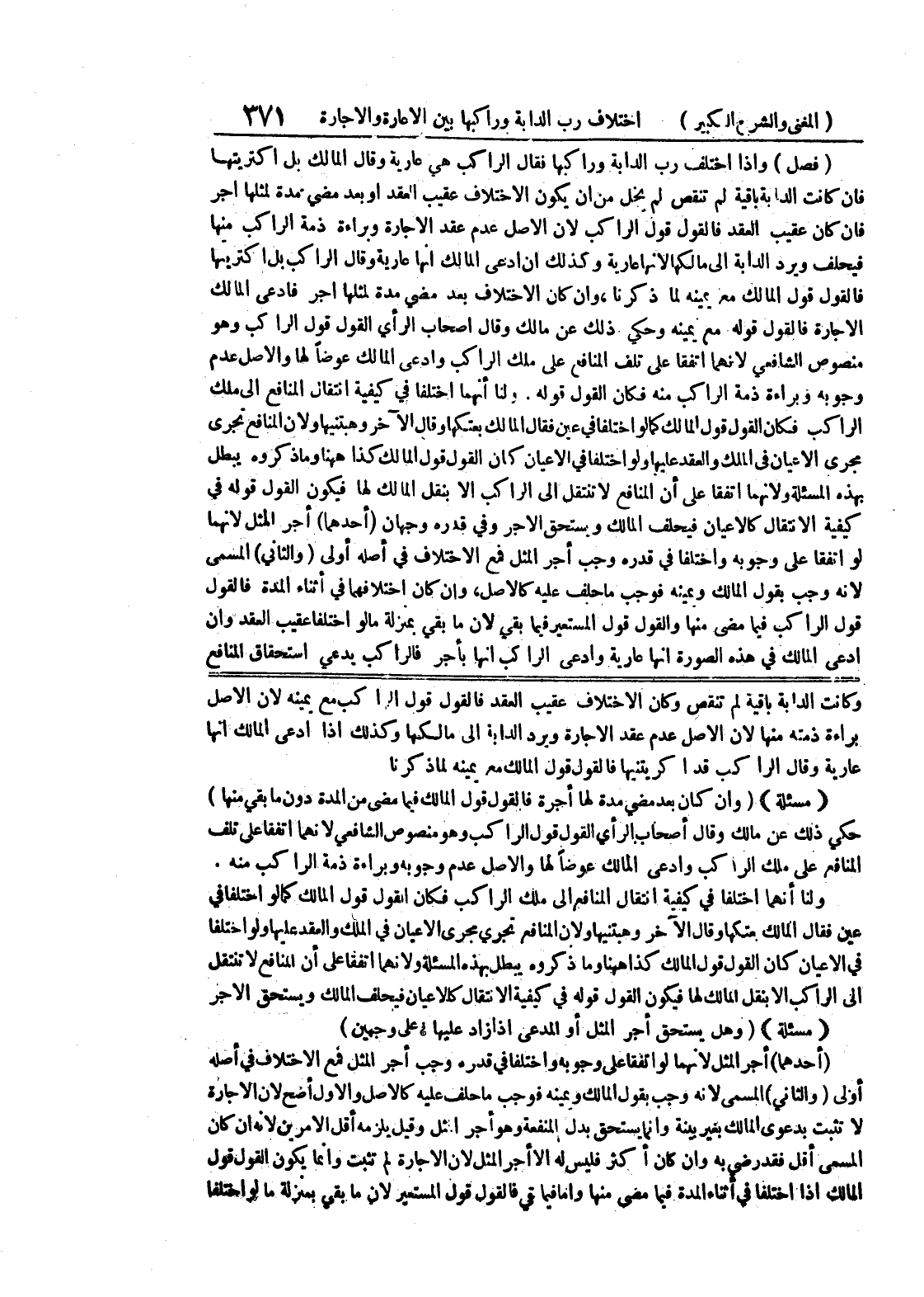 ولنا أنهما اختللفا في كيفية انتقال المنافع إلى ملك الراكب فكان القول قول المالك كما لو اختلفا في عين ققال المالك بعتكها وقال الآخر وهبتنيها ولأن المنافع تجري مجرى الأعيان في الملك والعقد عليها ولو اختلفا في الأعيان كان القول قول المالك كذا ههنا وما ذكروه يبطل بهذه المسألة ولأنهما اتفقا على أن المنافع لا تنتقل الى الراكب إلا بنقل المالك لها فيكون القول قول في كيفية الإنتقال كالأعيان فيحلف المالك ويستحق الأجر (مسألة) (وهل يستحق أجر المثل أو المدعي إذا زاد عليها؟ على وجهين) (أحدهما) أجر المثل لأنهما لو اتفقا على وجوبه واختفافي قدره وجب أجر المثل فمع الإختلاف في أصله أولى (والثاني) المسمى لأنه وجب بقول المالك ويمينه فوجب ما حلف عليه كالأصل والأول أصح لأن الإجارة لا تثبت بدعوى المالك بغير بينة وإنما يستحق بدل النفعة وهو أجر المثل وقيل يلزمه أقل الأمرين لأنه إن كان المسمى أقل ققد رضي به وإن كان أكثر فليس له إلا أجر المثل لأن الإجارة لم تثبت وإنما يكون القول قول المالك إذا اختلفا في أثناء المدة فيها مصى منها وأما فيما قي فالقول قول المستعير لأن ما بقي بمنزلة ما لو اختلفا