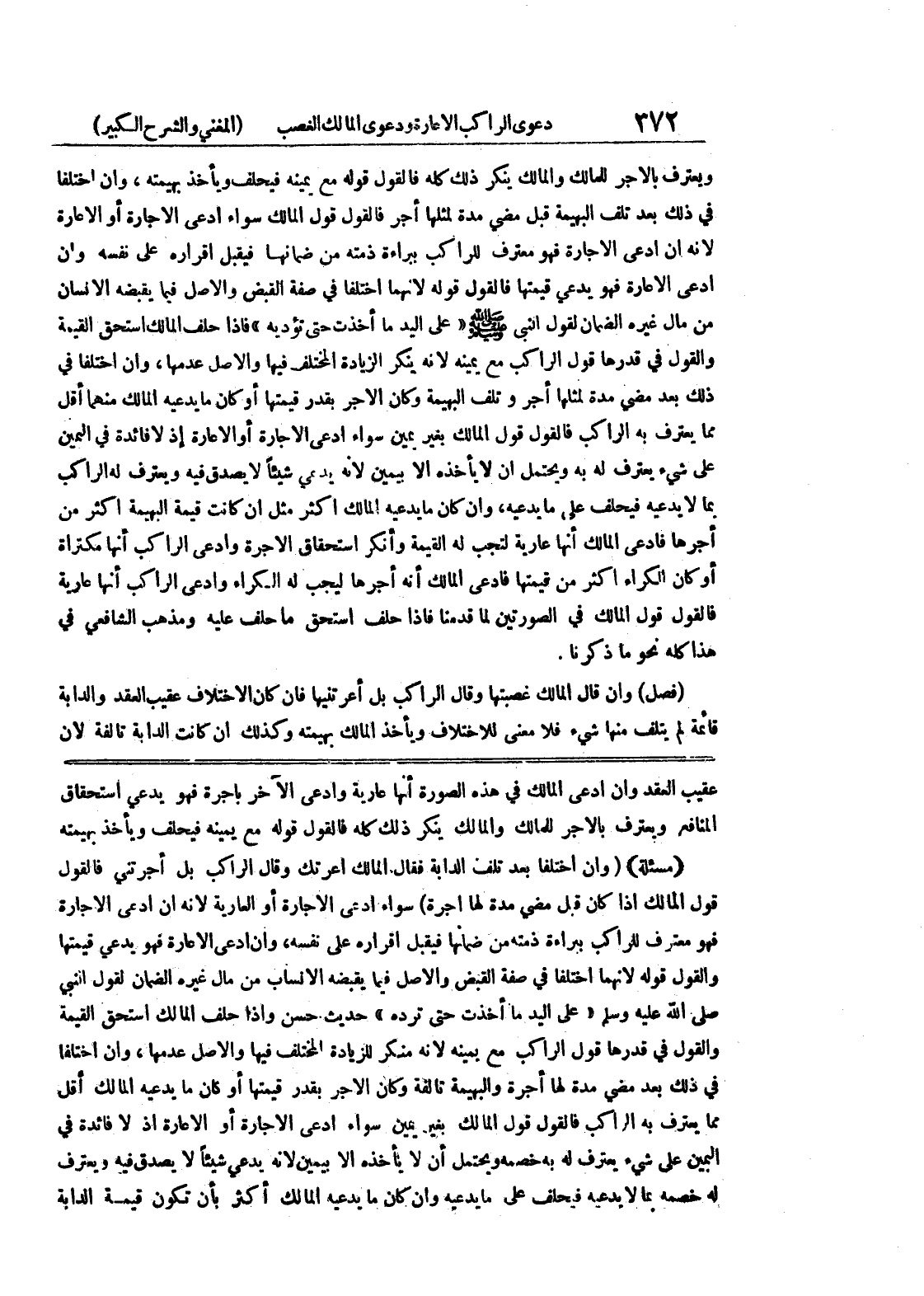 فهو معترف للراكب ببراءة ذمته من ضمانها فيقبل إقراره على نفسه، وإن ادعى الإعارة فهو يدعي قيمتها والقول قوله لأنهما اختلفا في صفة القبض والأصل فيما يقبضه الانساب من مال غيره الضمان لقول النبي صلى الله وسلم (على اليد ما أخذت حتى ترده) حديث حسن وإذا حلف المالك إستحق القيمة والقول في قدرها قول الراكب مع يمينه لأنه منكر للزيادة المختلف فيها والأصل عدما، وإن اختلفا في ذلك بعد مضي مدة لها أجرة والبهمية تالفة وكان الأجر بقدر قيمتها أو كان ما يدعيه المالك أقل مما يعترف به الراكب فالقول قول المالك بغير يمين سواء ادعى الإجارة أو الاعارة إذا لا فائدة في اليمين على شئ يعرف له به خصمه ويحتمل أن لا يأخذه إلا بيمين لأنه يدعي شيئاً لا يصدق فيه ويعترف له خصمه بما لا يدعيه فيحلف على ما يدعيه وإن كان ما يدعيه المالك أكثر بأن تكون قيمة الدابة