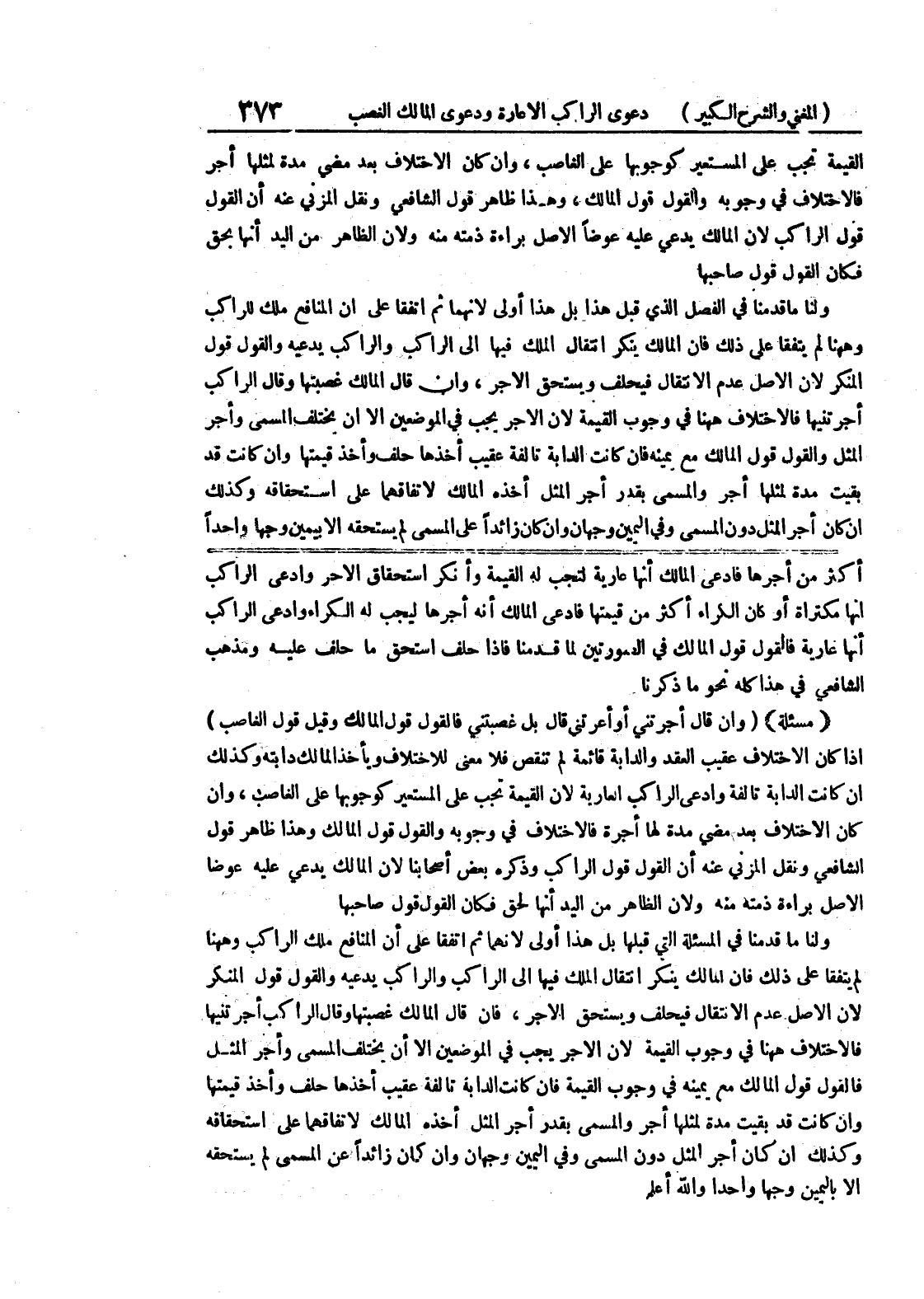 أكثر من أجرها فادعى المالك أنها عارية لتجب له القيمة وأنكر استحقاق الاخر ادعى الراكب إنها مكتراة أو كان الكراء أكثر من قيمتها فادعى المالك أنه أجرها ليجب له الكراء وادعى الراكب أنها عارية فالقمول قول المالك في الصورتين لما قدمنا فإذا حلف إستحق ما حلف عليه ومذهب الشافعي في هذا كله نحو ما ذكرنا (مسألة) (وإن قال أجرتني أو أعرتني قال بل غصبتني فالقول قول المالك وقبل قول الغاصب) إذا كان الاختلاف عقيب العقد والدابة قائمة لم تنقص فلا معنى للإختلاف ويأخذ المالك دابته وكذلك إن كانت الدابة تالفة وادعى الراكب العارية لأن القيمة تجب على المستعير كوجوبها على الغاصب، وإن كان الاختلاف بعد مضي مدة لها أجرة فالاختلاف في وجوبه والقول قول المالك وهذا ظاهر قول الشافعي ونقل المزني عنه أن القول قول الراكب وذكره بعض أصحابنا لأن المالك يدعي عليه عوضا الأصل براءة ذمته منه ولأن الظاهر من اليد أنها لحق فكان القول قول صاحبها ولنا ما قدمنا في المسألة التي قبلها بل هذا أولى لانهما ثم اتفقا على أن المنافع ملك الراكب وههنا لم يتفقا على ذلك فإن المالك ينكر إنتقال الملك فيها إلى الراكب والراكب يدعيه والقول قول المنكر لأن الأصل عدم الإنتقال فيحلف ويستحق الأجر، فإن قال المالك غصبتها وقال الراكب أجرتنيها