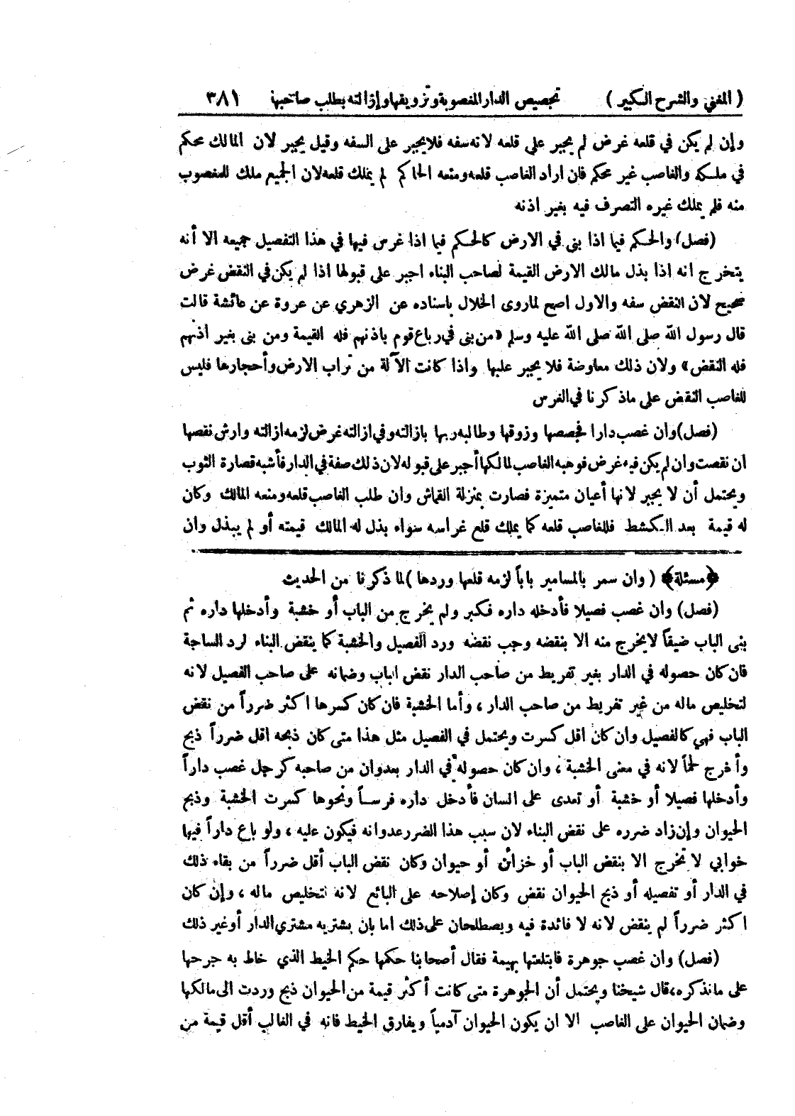 (مسألة) (وإن سمر بالمسامير بابالزمه قلعها وردها) لما ذكرنا من الحديث (فصل) وإن غصب فصيلاً فأدخله داره فكبر ولم يخرج من الباب أو خشبة وأدخلها دار ثم بنى الباب ضيقاً لا يخرج منه إلا بنقضه وجب نقضه ورد الفصيل والخشبة كما ينقض البناء لرد الساجة فإن كان حصوله في الدار بغير تفريط من صاحب الدار نقص الباب وضمانه على صاحب الفصيل لأنه لتخليص ماله من غير تفريط من صاحب الدار، وأما الخشبة فإن كان كسرها أكثر ضرراً من نقض الباب فهي كالفصيل وإن كان أقل كسرت ويحتمل في الفصيل مثل هذا متى كان ذبحه أقل ضرراً ذبح وأخرج لحماً لأنه في معنى الخشبة، وإن كان حصوله في الدار بعدوان من صاحبه كرجل غصب داراً وأدخلها فصيلاً أو خشبة أو تعدى على إنسان فأدخل داره فرسا ونحوها كسرت الخشبة وذبح الحيوان وإن زاد ضرره على نقض البناء لان سبب هذا الضرر عدوانه فيكون عينه، ولو باع داراً فيها خوابي لا تخرج إلا بنقض الباب أو خزائن أو حيوان وكان نقض الباب أقل ضرراً من بقاء ذلك في الدار أو تفصيله أو ذبح الحيوان نقض وكان إصلاحه على البائع لأنه لتخليص ماله، وإن كان أكثر ضرراً لم ينقض لأنه لا فائدة فيه ويصطلحان على ذلك أما بأن يشتريه مشتري الدار أو غير ذلك (فصل) وإن غصب جوهرة فابتلعتها بهيمة فقال أصحابنا حكمها حكم الخيط الذي خاط به جرحها على ما نذكره، قال شيخنا ويحتمل أن الجوهرة متى كانت أكثر قيمة من الحيوان ذبح وردت إلى مالكها وضمان الحيوان على الغاصب إلا أن يكون الحيوان آدمياً ويفارق الخيط فإنه في الغالب أقل قيمة من
