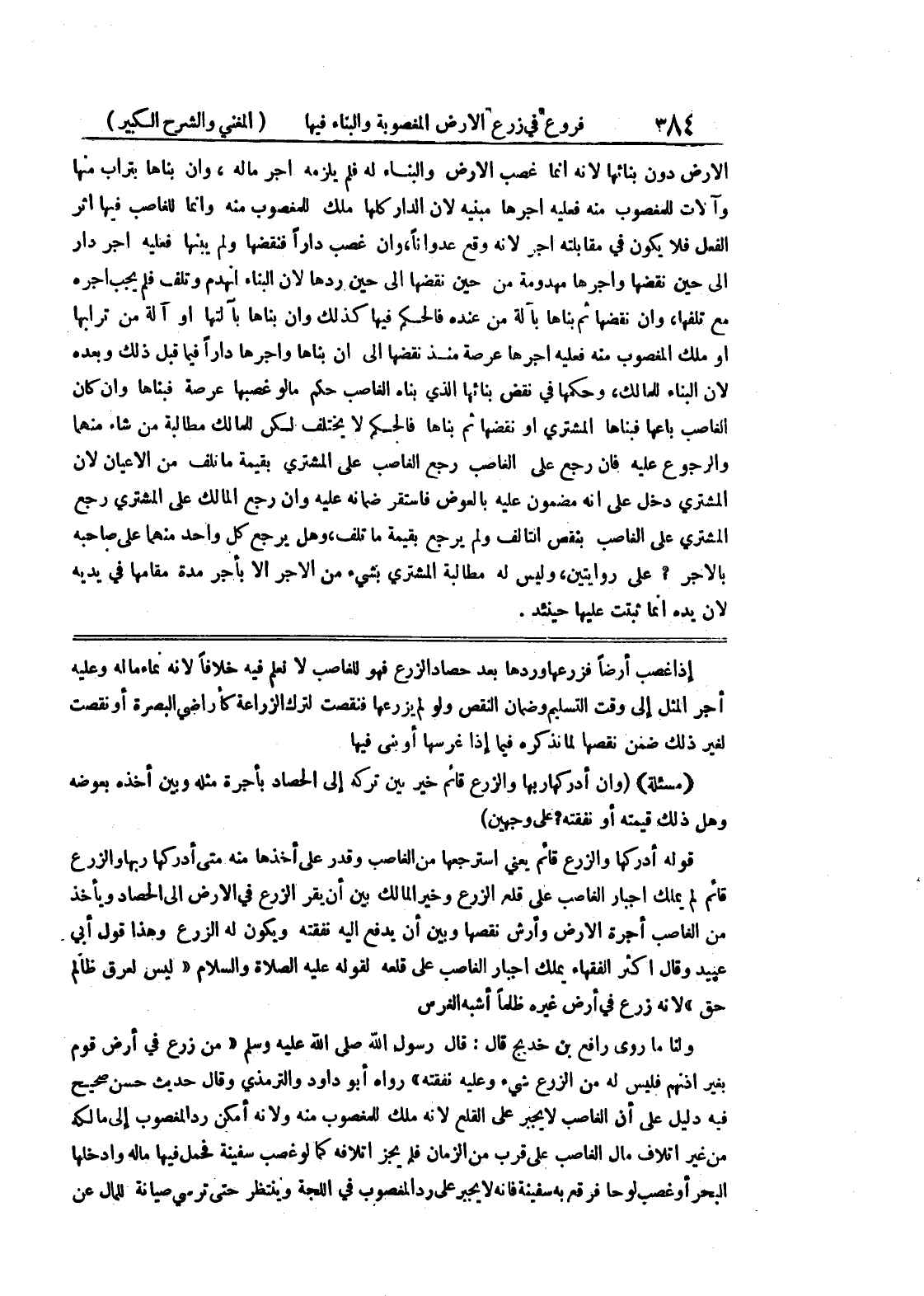 إذا غصب أرضاً فزرعها وردها بعد حصاد الزرع فهو للغاصب لا نعلم فيه خلافاً لأنه نماء ماله وعليه أجر المثل إلى وقت التسليم وضمان النقص ولو لم يزرعها فنقصت لترك الزراعة كأراضي البصرة أو نقصت لغير ذلك ضمن نقصها لما نذكره فيما إذا غرسها أو بنى فيها (مسألة) (وإن أدركها ربها وازرع قائم خير بين تركه إلى الحصاد بأجرة مثله وبين أخذه بعوضه وهل ذلك قيمته أو نفقته؟ على وجهين) قوله أدركها والزرع قائم يعني استرجعها من الغاصب وقدر على أخذها منه متى أدركها ربها والزرع قائم لم يملك إجبار الغاصب على قلع الزرع وخير المالك بين أن يقر الزرع في الأرض إلى الحصاد ويأخذ من الغاصب أجرة الأرض وأرش نقصها وبين أن يدفع إليه نفقته ويكون له الزرع وهذا قول أبي عبيد وقال أكثر الفقهاء يملك إجبار الغاصب على قلعه لقوله عليه الصلاة والسلام ((ليس لعرق ظالم حق) لأنه زرع في أرض غيره ظلماً أشبه الغرس ولنا ما روى رافع بن خدبج قال: قال رسول الله صلى الله عليه وسلم (من زرع في أرض قوم
