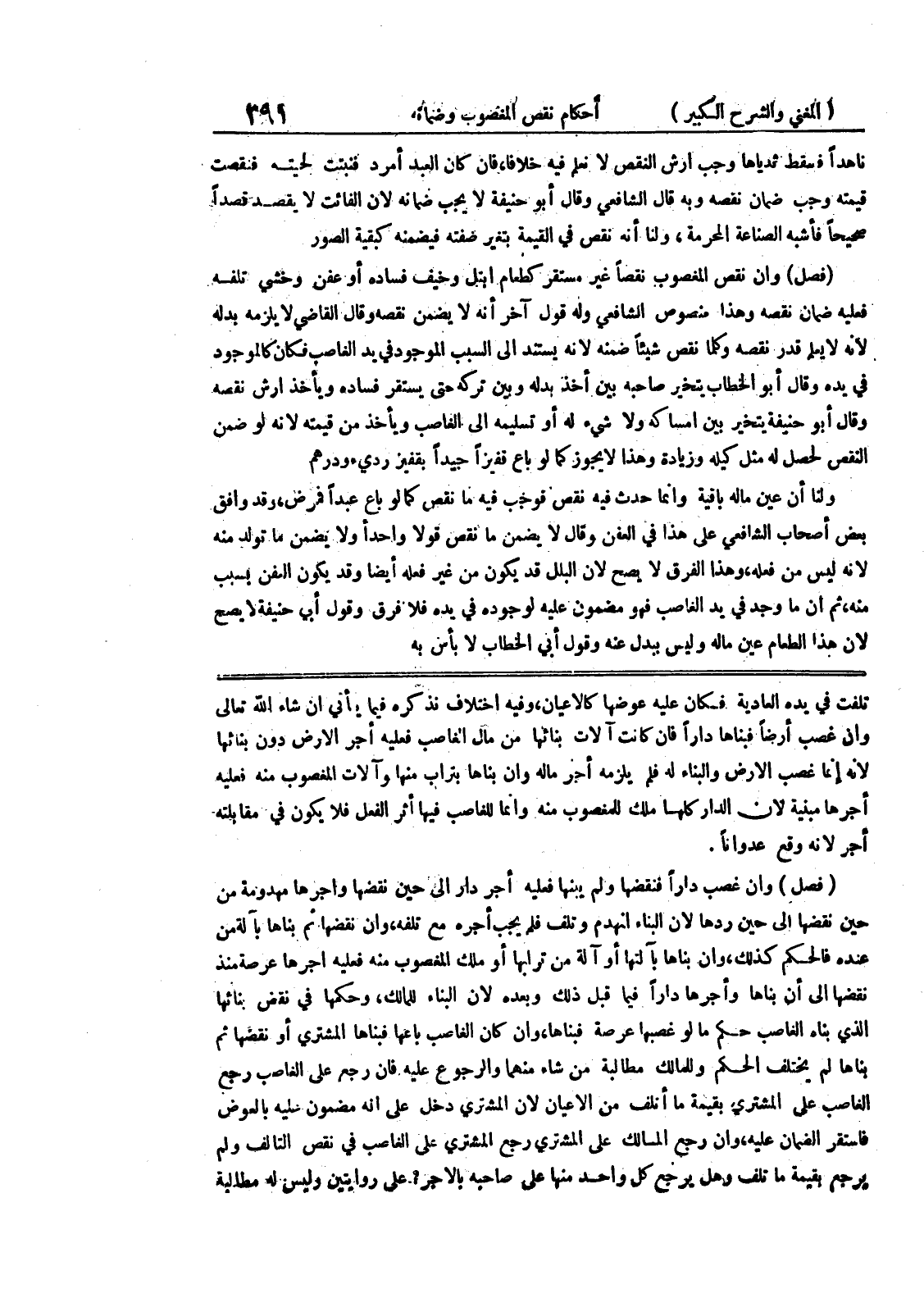 (فصل) وإن غصب درار فنقضها ولم يبنها فعليه أجر دار إلى حين نقضها وأجرها مهدومة من حين نقضها إلى حين ردها لأن البناء انهدم وتلف فلم يجب أجره مع تلفه، وإن نقضها ثم بناها بآلة من عنده فالحكم كذلك، وإن بناها بآلتها أو آلة من ترابها أو ملك المغصوب منه فعليه أجرها عرصة منذ نقضها إلى أن بناها وأجرها داراً فيما قبل ذلك وبعده لأن البناء للمالك، وحكمها في نقض بنائها الذي بناه الغاصب حكم مالو غصبها عرصة فبناها، وإن كان الغاصب باعها فبناها المشتري أو نقضها ثم بناها لم يختلف الحكم وللمالك مطالبة من شاء منهما والرجوع عليه فإن رجع عليه الغاصب رجع الغاصب على المشتري بقيمة ما اتلف من الأعيان لأن المشتري دخل على أنه مضمون عليه بالعوض
