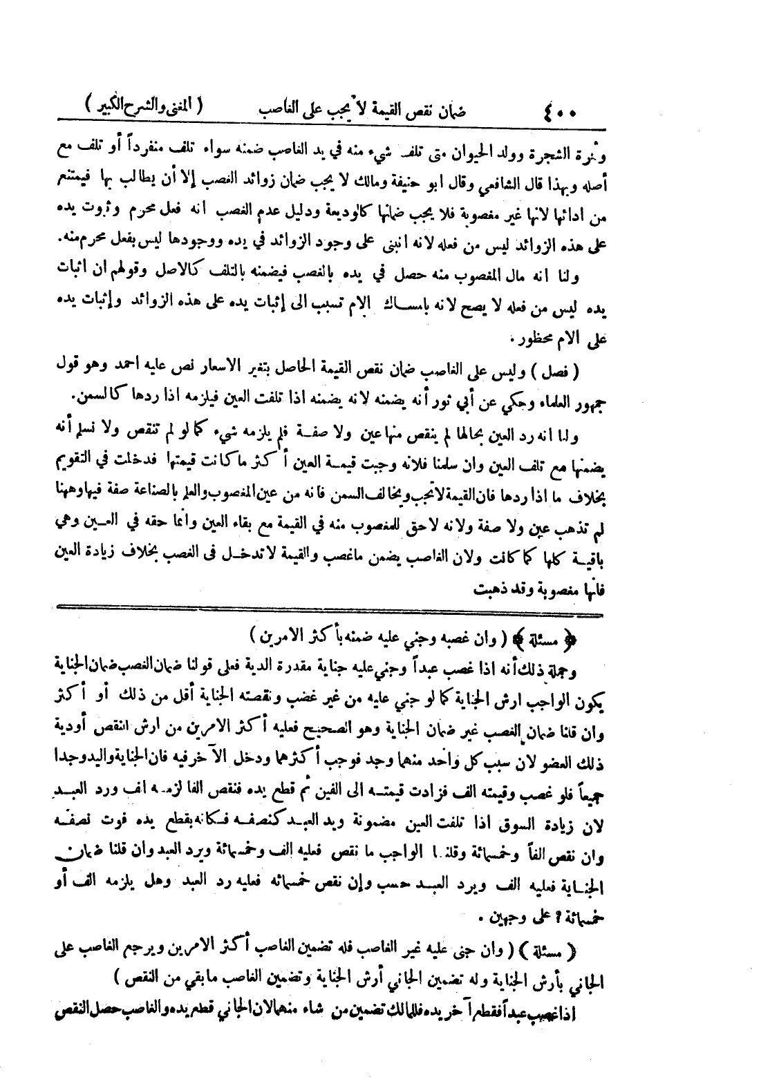 (مسألة) (وان غصبه وجني عليه ضمنه بأكثر الأمرين) وجملة ذلك أنه إذا غصب عبداً وجني عليه جناية مقدرة الدية فعلى قولنا ضمان الغصب ضمان الجناية يكون الواجب أرش الجناية كما لو جنى عليه من غير غصب ونقصته الجناية أقل من ذلك أو اكثر وإن قلنا ضمان الغصب غير ضمان الجناية وهو الصحيح فعليه أكثر الأمرين من أرش النقنص أو دية ذلك العضو لأن سبب كل واحد منهما وجد فوجب أكثرهما ودخل الآخر فيه فإن الجناية واليد وجدا جميعاً فلو غصب وقيمته ألف فزادت قيمته إلى ألفين ثم قطع يده فنقص ألفا لزمه ألف ورد العبد لأن زيادة السوق إذا تلفت العين مضمونة ويد العبد كنصفه فكان يقطع يده فوت نصفه وإن نقص ألفاً وخمسمائة وقلنا الواجب ما نقص فعليه ألف وخمسمائة ويرد العبد وإن قلنا ضمان الجناية فعليه ألف ويرد العبد حسب وإن نقص خمسمائة فعليه رد العبد وهل يلزمه ألف أو خمسمائة؟ على وجهين.