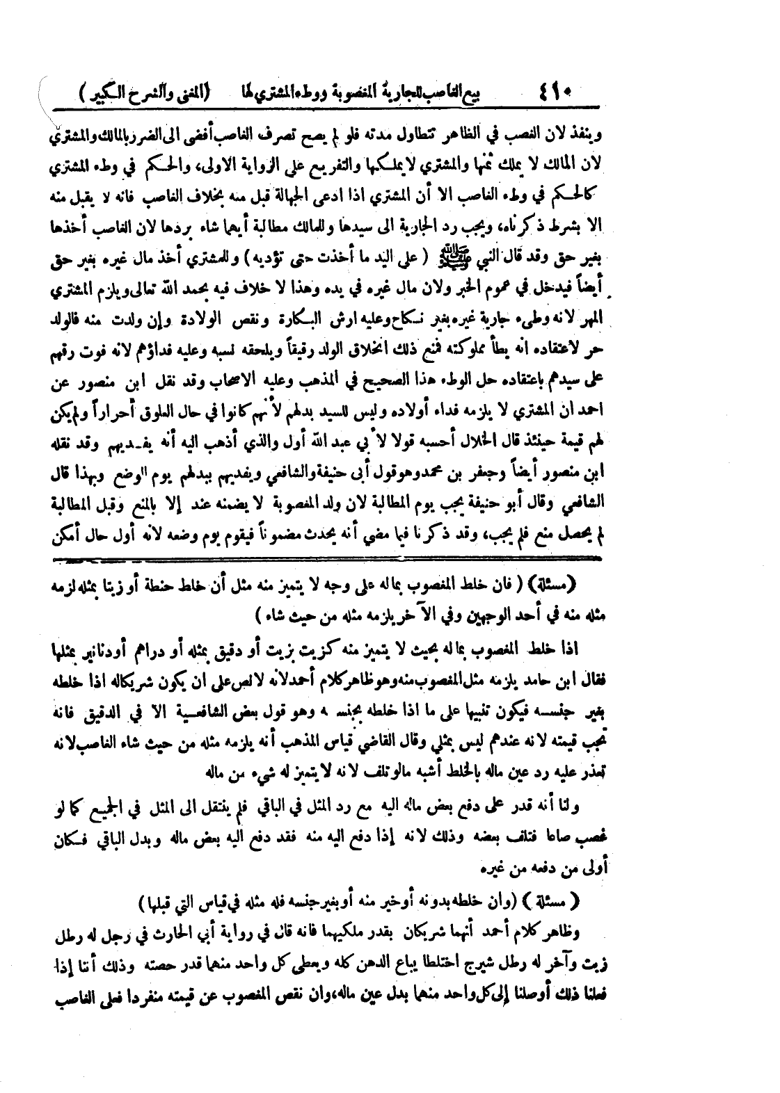 (مسألة) (فان خلط المغصوب بماله على وجه لا يتميز منه مثل أن خلط حنطة أو زيتا بمثله لزمه مثله منه في أحد الوجهين وفي الآخر يلزمه مثله من حيث شاء) إذا خلط المغصوب بماله بحيث لا يتميز منه كزيت بزيت أو دقيق بمثله أو دراهم أو دنانير بمثلها فقال ابن حامد يلزمه مثل المغصوب منه وهو ظاهر كلام أحمد لأنه لا نص على أن يكون شريكاً له إذا خلطه بغير جنسه فيكون تنبيها على ما إذا خلطه بجنسه وهو قول بعض الشافعية إلا في الدقيق فإنه تجب قيمته لأنه عندهم ليس بمثلي وقال القاضي قياس المذهب أنه يلزمه مثله من حيث شاء الغاصب لأنه تعذر عليه رد عين ماله بالخلط أشبه مالو تلف لأنه لا يتميز له شئ من ماله ولنا أنه قدر على دفع بعض ماله إليه مع رد المثل في الباقي فلم يتنقل إلى المثل في الجميع كما لو غصب صاعاً فتلف بعضه وذلك لأنه إذا دفع إليه منه فقد دفع إليه بعض ماله وبدل الباقي فكان أولى من دفعه من غيره (مسألة) (وإن خلطه بدونه أو خير منه أو بغير جنسه فله مثله في قياس التي قبلها) وظاهر كلام أحمد أنهما شريكان بقدر ملكيهما فإنه قال في رواية أبي الحارث في رجل له رطل زيت وآخر له رطل شيرج اختلطا يباع الدهن كله ويعطي كل واحد منهما قدر حصته وذلك أننا إذا فعلنا ذلك أو صلنا إلى كل واحد منهما يدل عين ماله، وإن نقص المغصوب عن قيمته منفرداً فعلى الغاصب