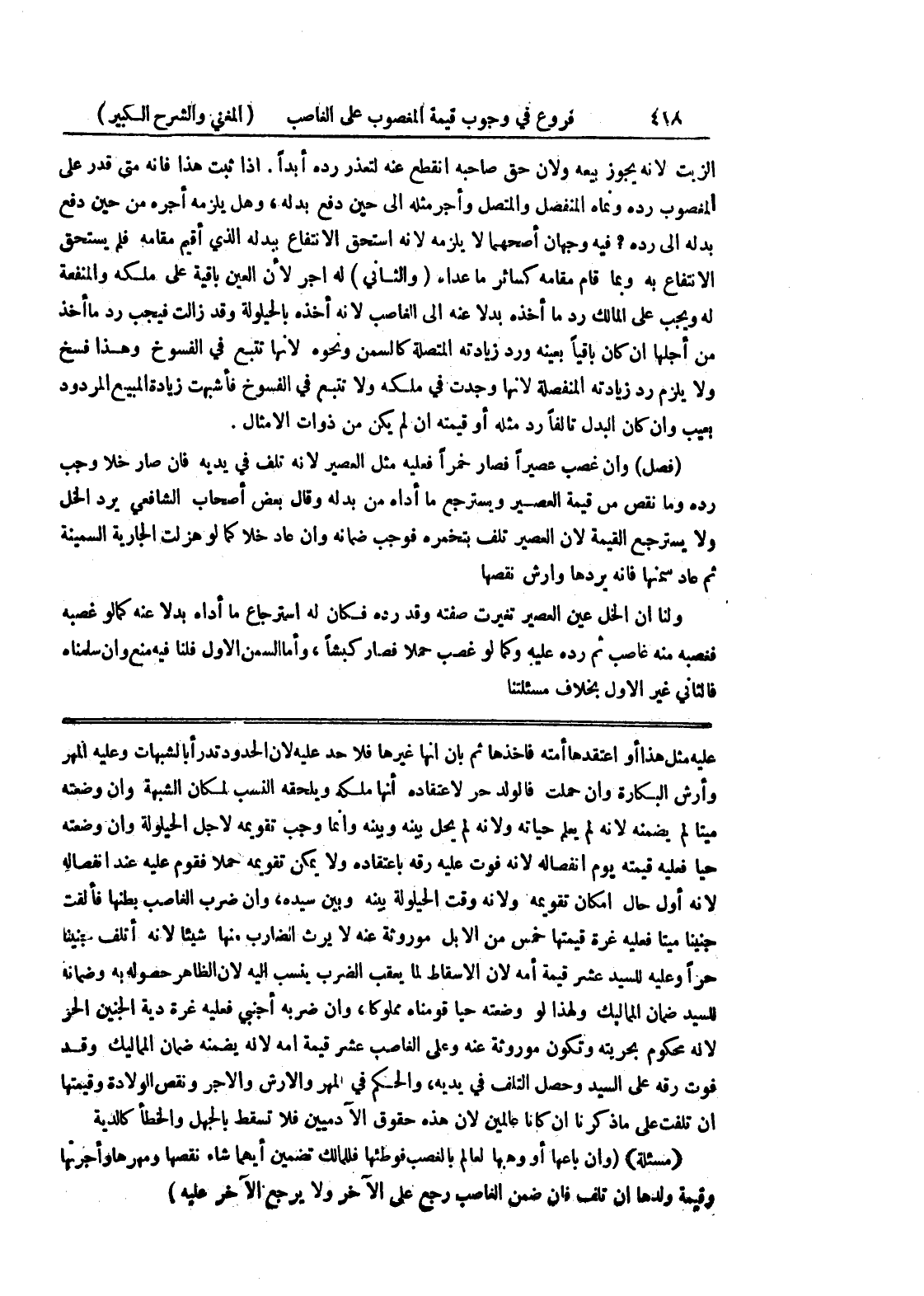 عليه مثل هذا أو اعتقدها أمته فأخذها ثم بان أنها غيرها فلا حد عليه لأن الحدود تدرأ بالشبهات وعليه المهر وأرش البكارة وإن حملت فالولد حر لاعتقاده أنها ملكة ويحلقه النسب لمكان الشبهة وإن وضعته ميتاً لم يضمنه لأنه لم يعلم حياته ولأنه لم يحل بينه وبينه وإنما وجب تقويمه لا جل الحيلولة وإن وضعته حيا فعليه قيمته يوم انفصاله لأنه فوت عليه رقه باعتقاده ولا يمكن تقويمه حملاً فقوم عليه عند انفصاله لانه أول حال إمكان تقويمه ولأنه وقت الحيلولة بينه وبين سيده، وإن ضرب الغاصب بطنها فألقت جنبنا ميتاً فعليه غرة قيمتها خمس من الإبل موروثة عنه لا يرث الضارب منها شيئاً لأنه أتلف جنبنا حراً وعليه للسيد عشر قيمة أمه لأن الإسقاط لما يعقب الضرب ينسب إليه لأن الظاهر حصوله به وضمانه للسيد ضمان المماليك ولهذا لو وضعته حياً قومناه مملوكا، وان ضربه أجبني فعليه غرة دية الجنين الحر لأنه محكوم بحريته وتكون مورثة عنه وعلى الغاصب عشر قيمة أمه لأنه يضمنه ضمان المماليك وقد فوت رقه على السيد وحصل التلف في يديه، والحكم في المهر والأرش والأجر ونقص الولادة وقيمتها إن تلفت على ما ذكرنا إن كانا عاليمن لأن هذه حقوق الآدميين فلا تسقط بالجهل والخطأ كالدية (مسألة) (وإن باعها أو وهبها لعالم بالغصب فوطئها فللمالك تضمين أيهما شاء نقصها ومهرها وأجرتها