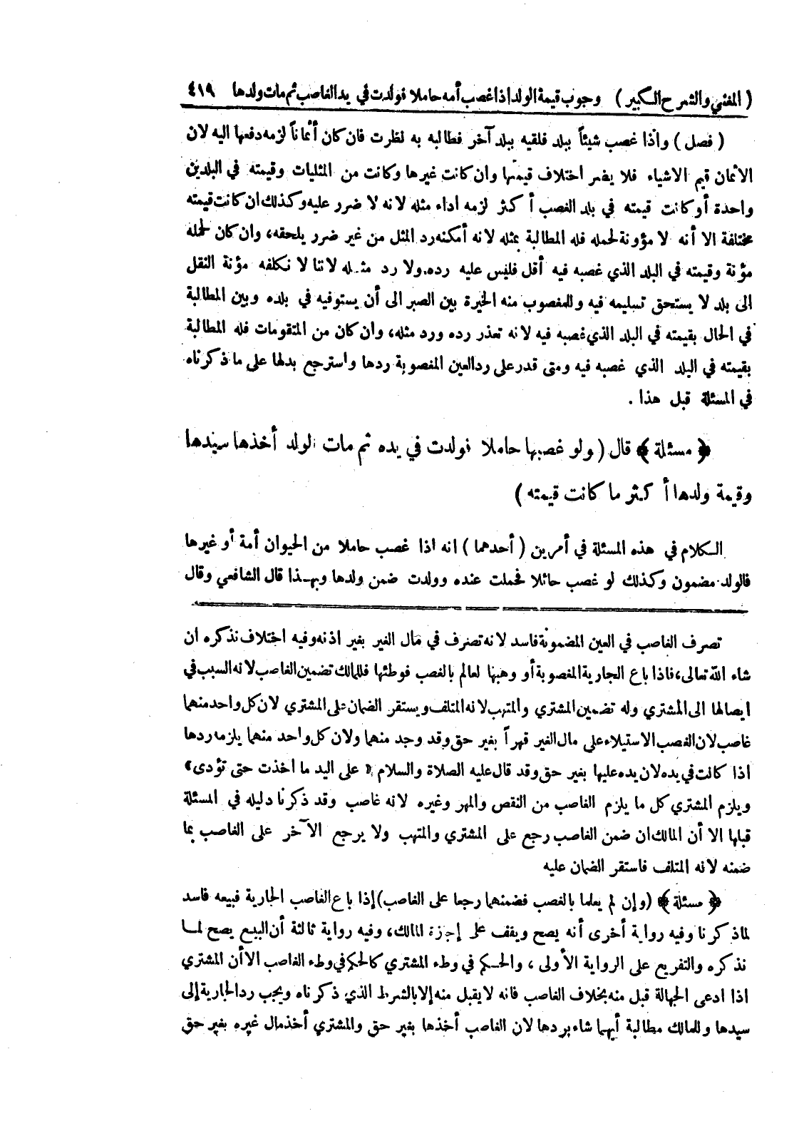 تصرف الغاصب في العين المضمونة فاسد لأنه تصرف في مال الغير بغير إذنه وفيه اختلاف نذكره إن شاء الله تعالى، فإذا باع الجارية المغصوبة أو وهبها لعالم بالنصب فوطئها فللمالك تضمين الغاصب لأنه السبب في إيصالها إلى المشتري وله تضمين المشتري والمتهب لأنه المتلف ويستقر الضمان على المشتري لأن كل واحد منهما غاصب لأن الغصب الاستيلاء على مال الغير قهراً بغير حق وقد وجد منهما ولأن كل واحد منهما يلزم ردها إذا كانت في يده لأن يده عليها بغير حق وقد قال عليه الصلاة والسلام (على اليد ما أخذت حتى تؤدي) ويلزم المشتري كل ما يلزم الغاصب من النقص والمهر وغيره لأنه غاصب وقد ذكرنا دليله في المسألة قبلها إلا أن المالك إن ضمن الغاصب رجع على المشتري والمتهب ولا يرجع الآخر على الغاصب بما ضمنه لأنه المتلف فاستقر الضمان عليه (مسألة) (وإن لم يعلما بالغصب فضمنهما رجعا على الغاصب) إذا باع الغاصب الجارية فبيعه فاسد لما ذكرنا وفيه رواية أخرى أنه يصح ويقف على إجازة المالك وفيه رواية ثالثة أن البيع يصح لما نذكره والتفريع على الرواية الأولى، والحكم في وطئ المشتري كالحكم في وطئ الغاصب إلا أن المشتري إذا ادعى الجهالة قبل منه بخلاف الغاصب فإنه لا يقبل منه إلا بالشرط الذي ذكرناه ويجب رد الجارية إلى سيدها وللمالك مطالبة أيهما شاء بردها لأن الغاصب أخذها بغير حق والمشتري أخذ مال غيره بغير حق