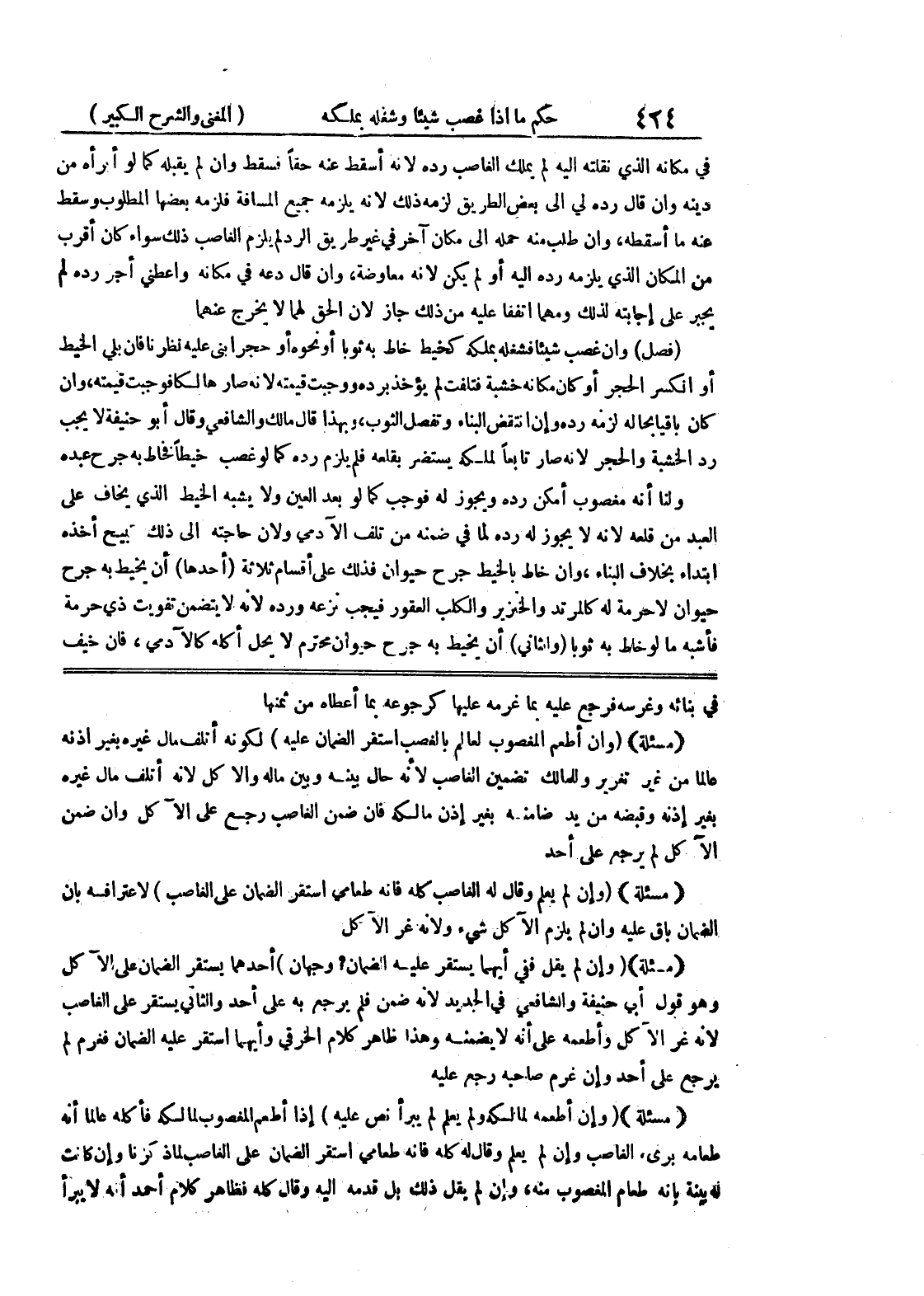 في بنائه وغرسه فرجع عليه بما غرمه عليها كرجوعه بما أعطاه من ثمنها (مسألة) (وإن أطعم المغصوب لعالم بالغصب استقر الضمان عليه) لكونه أتلف مال غيره بغير إذنه عالماً من غير تعرير وللمالك تضمين الغاصب لأنه حال بينه وبين ماله والآكل لأنه أتلف مال غيره بغير إذنه وقبضه من يد ضامنه بغير إذن مالكه فإن ضمن الغاصب رجع على الآكل وإن ضمن الآكل لم يرجع على أحد (مسألة) (وإن لم يعلم وقال له الغاصب كله فإنه طعامي استقر الضمان على الغاصب) لاعتراف، بأن الضمان باق عليه وإن لم يلزم الآكل شئ ولأنه غر الآكل (مسألة) (وإن لم يقل ففي أيهما يستقر عليه الضمان؟ وجهان) أحدهما يستقر الضمان على الآكل وهو قول أبي حنيفة والشافعي في الجديد لأنه ضمن فلم يرجع به على أحد والثاني يستقر على الغاصب لأنه غر الآكل وأطعمه على أنه لا يضمنه وهذا ظاهر كلام الخرقي وأيهما استقر عليه الضمان فغرم لم يرجع على أحد وإن غرم صاحبه رجع عليه (مسألة) (إن أطعمه لمالكه ولم يعلم لم يبرأ نص عليه) إذا أطعم المغصوب لمالكه فأكله عالماً أنه