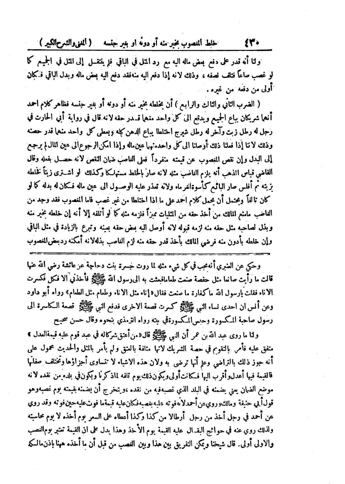 وحكي عن العنبري أنه يجب في كل شئ مثله لما روت جسرة بنت دجاجة عز عائشة رضي الله عنها قالت ما رأيت صانعاً مثل حفصة صنعت طعاماً فبعثت به إلى رسول الله صلى الله عليه وسلم فأخذني الافكل فكسرت الإناء فقلت يا رسول الله ما كفارة ما صنعت فقال (إنا مثل الإناء وطعام مثل الطعام) رواه أبو داود وعن أنس أن احد نساء النبي صلى الله عليه وسلم كسرت قصعة الأخرى فدفع النبي صلى الله عليه وسلم قصعة الكاسرة إلى رسول صاحبة المكسورة وحبس المكسورة في بيته رواه الترمذي بنحوه وقال حسن صحيح ولنا ما روى عبد الله بن عمر أن النبي صلى الله عليه وسلم قال (من أعتق شركاله في عبد قوم عليه قيمة العدل) متفق عليه فأمر بالتقويم في حصة الشريك لأنها متلفة بالعتق ولم يأمر بالمثل والحديث محمول على أنه جوز ذلك بالتراضي وعلم أنها ترضى به ولأن هذه الأشياء لا تتساوى أجزاؤها وتخلف صفلتها فالقيمة فيها أعدل وأقرب إليها فكانت أولى ويكون ذلك يوم تلفه لما ذكرنا ويكون في بلده من نقده لأنه موضع الضمان يعني يضمنه في البلد الذي غصبه فيه من نقده، ويتخرج أن يضمنه بقيمته يوم غصبه وهو