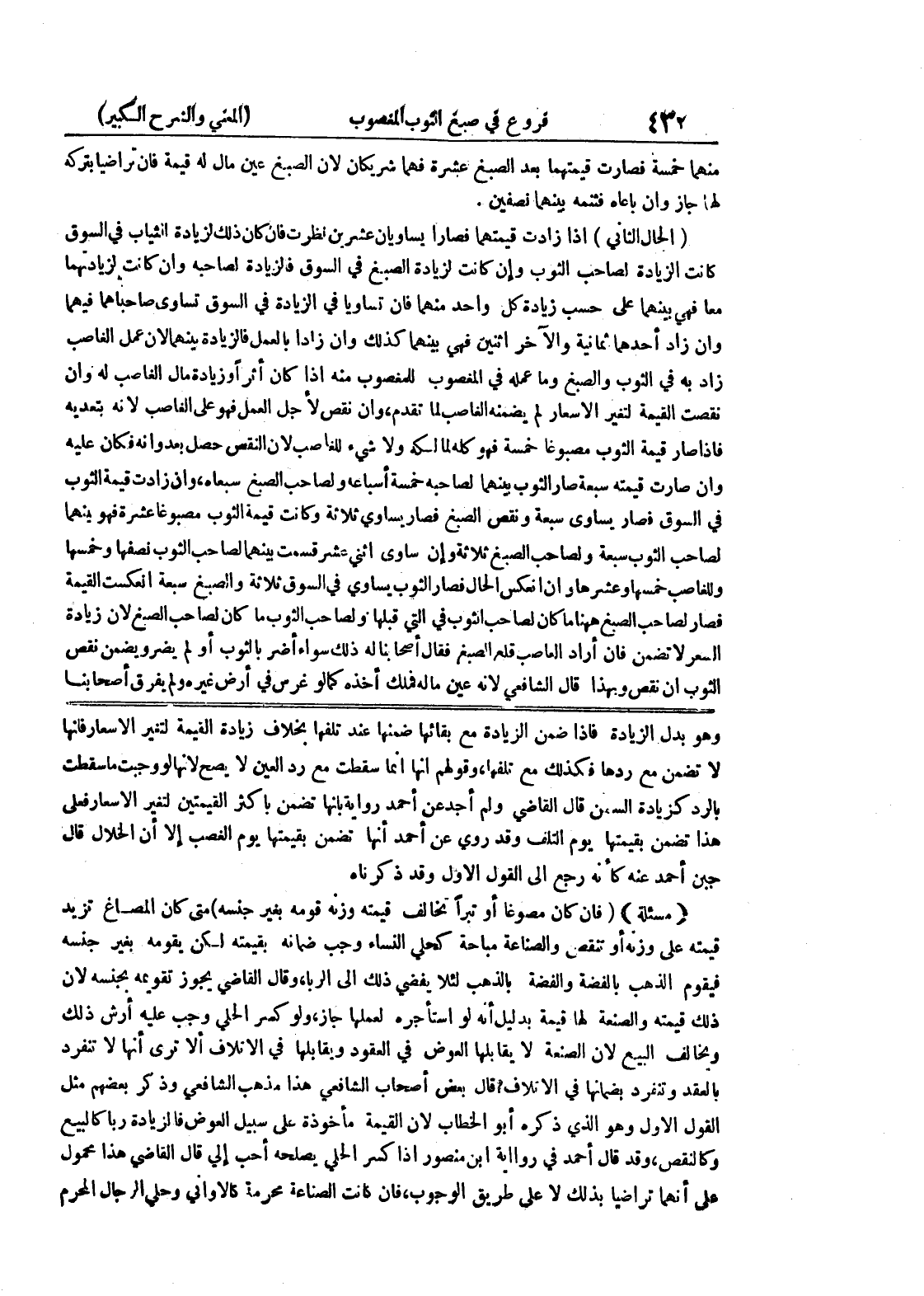 بالرد كزيادة السمن قال القاضي ولم أجد عن أحمد رواية بأنها تضمن بأكثر القيمتين لتغير الأسعار فعلى هذا تضمن بقيمتها يوم التلف وقد روي عن أحمد أنها تضمن بقيمتها يوم الغصب إلا أن الخلال قال جبن أحمد عنه كأنه رجع إلى القول الأول وقد ذكرناه (مسألة) (فإن كان مصوغاً أو تبراً تخالف قيمته وزنه قومه بغير جنسه) متى كان المصاغ تزيد قيمته على وزنه أو تنقص والصناعة مباحة كحلي السناء وجب ضمانه بقيمته لكن يقومه بغير جنسه فيقوم الذهب بالفضة والفضة بالذهب لئلا يفضي ذلك إلى الربا، وقال القاضي يجوز تقويمه بجنسه لأن ذلك قيمته والصنعة لها قيمة بدليل أنه لو استأجره لعملها جاز، ولو كسر الحلي وجب عليه أرش ذلك ويخالف البيع لأن الصنعة لا يقابلها العوض في العقود ويقابلها في الإتلاف ألا ترى أنها لا تنفرد بالعقد وتنفرد بضمانها في الإتلاف؟ قال بعض أصحاب الشافعي هذا مذهب الشافعي وذكر بعضهم مثل القول الأول وهو الذي ذكره أبو الخطاب لأن القيمة مأخوذة على سبيل العوض فالزيادة ربا كالبيع وكالنقص، وقد قال أحمد في روااية ابن منصور إذا كسر الحلي يصلحه أحب إلي قال القاضي هذا محمول على أنهما تراضيا بذلك لا على طريق الوجوب، فإن كانت الصناعة محرمة كالأواني وحلي الرجال المحرم