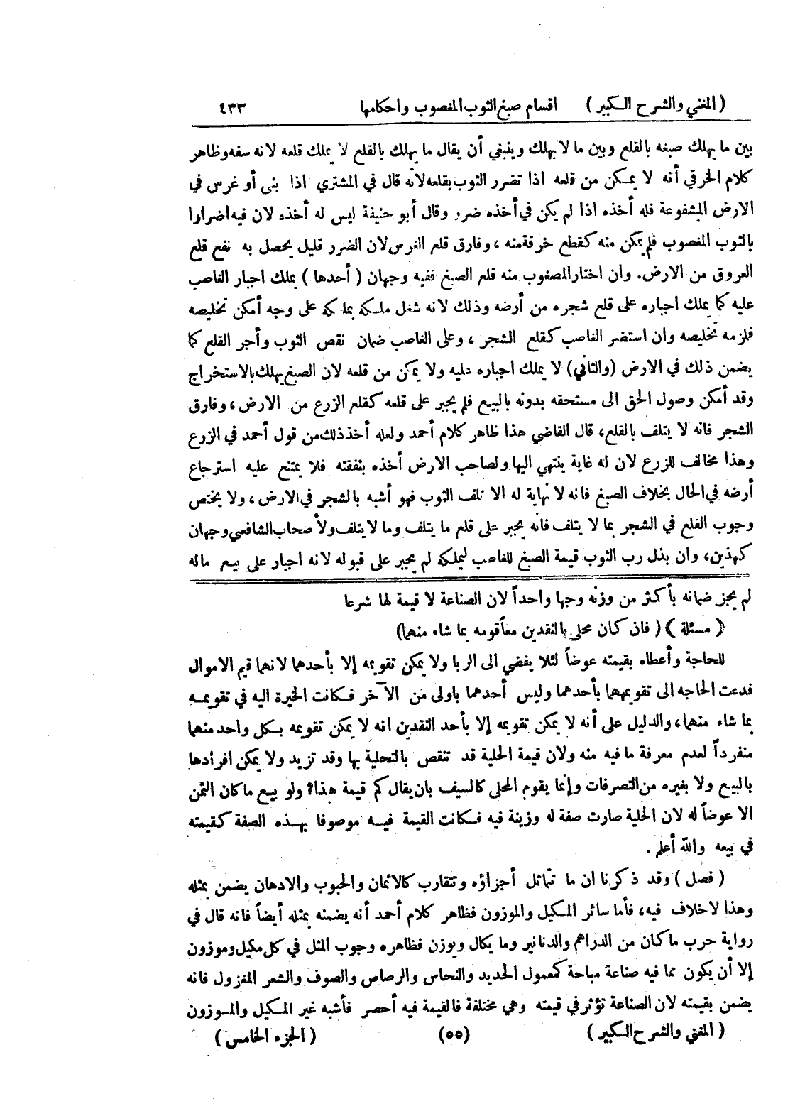 لم يجز ضمانه بأكثر من وزنه وجهاد واحداً لأن الصناعة لا قيمة لها شرعا (مسألة) (فإن كان محلى بالنقدين معاقومه بما شاء منهما) للحاجة وأعطاه بقيمته عوضاً لئلا يفضي إلى الربا ولا يمكن تقويمه إلا بأحدهما لأنهما قيم الأموال فدعت الحاجة إلى تقويمهما بأحدهما وليس أحدهما بأولى من الآخر فكانت الخيرة إليه في تقويمه بما شاه منهما، والدليل على أنه لا يمكن تقويمه إلا بأحد النقدين أنه لا يمكن تقويمه بكل واحد منهما منفرداً لعدم معرفة ما فيه منه ولأن قيمة الحلية قد تنقص بالتحلية بها وقد تزيد ولا يمكن إفرادها بالبيع ولا بغيره من التصرفات وإنما يقوم المحلى كالسيف بأن يقال كم قيمة هذا؟ ولو بيع ماكان الثمن إلا عوضاً له لأن الحلية صارت فصة له وزينة فيه فكانت القيمة فيه موصوفا بهذا الصفة كقيمته في بيعه والله أعلم.