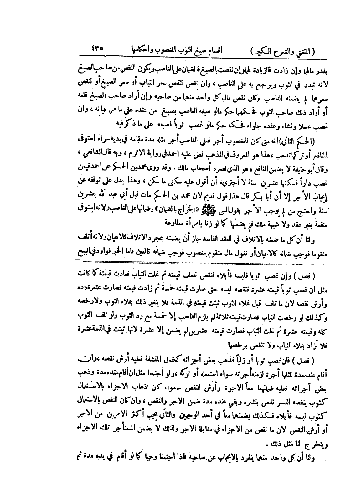 وإرش نقصه لأن ما تلف قبل غلاء الثوب ثبتت قيمته، في الذمة فلا يتغير ذلك بغلاء الثوب ولا رخصه وكذلك لو رخصت الثياب فارت قيمته ثلاثة لم يلزم الغاصب إلا خمسة مع رد الثوب ولو تلف الثوب كله وقيمته عشرة ثم غلت الثياب فصارت قيمته عشرين لم يضمن إلا عشرة لأنها تثبت في الذمة عشرة فلا تزاد بغلاء الثياب ولا تنقص برخصها (فصل) فإن غصب ثوباً أو زلياً فذهب بعض أجزائه كخمل المنشفة فعليه أرش نقصه، وإن أقام عنده مدة لمثلها أجرة لزمته أجرته سواء استمعله أو تركه، ولو اجتمعا مثل إن أقام عنده مدة وذهب بعض أجزائه فعليه ضمانهما معاً الأجرة وأرش النقص سواء كان ذهاب الأجزاء بالإستعمال كثوب ينقصه النسر نقص بنشره وبقي عنده مدة ضمن الأجر والنقص، وإن كان النقص بالاستمال كثوب لبسه فأبلاه فكذلك يضمنهما معاً في أحد الوجهين والثاني يجب أكثر الأمرين من الأجر أو أرش النقص لأن ما نقص من الاجزاء في مقابلة الأجر ولذلك لا يضمن المستأجر تلك الأجزاء ويتخرج لنا مثل ذلك.