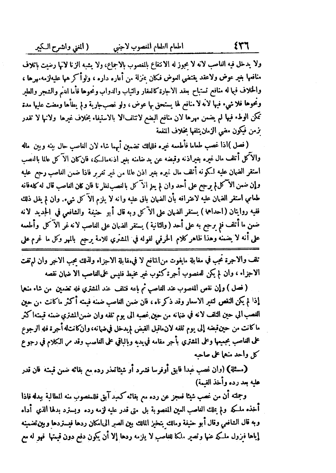 تف والأجرة تجب في مقابلة من المنافع لا في مقابلة الأجزاء ولذلك يجب الأجر وإن لم تفقت الأجزاء، وإن لم يكن للمغصوب أجرة كثوب غير مخيط فليس على الغاصب الاضمان نقصه (فصل) وإن نقص المغصوب عندا لغاصب ثم باعه فتلف عند المشتري فله تضمين من شاء منهما إذا لم يكن النقص لتغير الأسعار وقد ذكرناه، فإن ضمن الغاصب ضمنه فيمته أكثر ما كانت من حين الغصب إلى حين التلف لأنه في ضمانه من حين غصبه إلى يوم تلفه وإن ضمن المشتري ضمنه قيمته أكثر ما كانت من حين قبضه إلى يوم تلفه لأن ما قبل القبض لم يدخل في ضمانه، وإن كانت له أجرة فله الرجوع على الغاصب بجمعيها وعلى المشتري بأجر مقامه في يده وبالباقي على الغاصب وقد مر الكلام في رجوع كل واحد منهما على صاحبه (مسألة) (وان غصب عبداً فأبق أو فرساً فشرد أو شيئاً تعذر رده مع بقائه ضمن قيمته فإن قدر