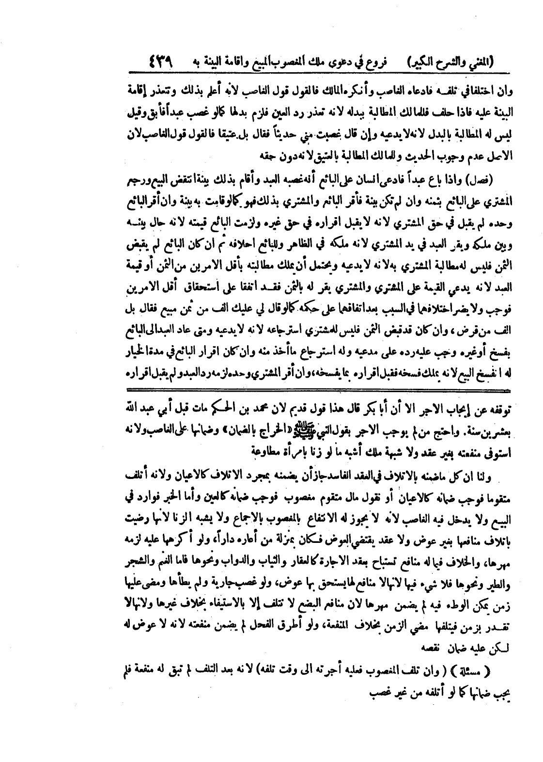 واحتج من لم يوجب الأجر بقول النبي صلى الله عليه وسلم (الخراج بالضمان) وضمانها على الغاصب ولأنه استوفى منفعته بغير عقد ولا شبهة ملك أشبه مالو زنا بامرأة مطاوعة ولنا أن كل ما ضمنه بالإتلاف في العقد الفاسد جاز أن يضمنه بمجرد الإتلاف كالأعيان ولأنه أتلف متقوماً فوجب ضمانه كالأعيان أو نقول مال متقوم مغصوب فوجب ضمانه كالعين وأما الخبر فوارد في البيع ولا يدخل فيه الغاصب لأنه لا يجوز له الانتفاع بالمغصوب بالإجماع ولا يشبه الزنا لأنها رضيت بإتلاف منافعها بغير عوض ولا عقد يقتضي العوض فكان بمنزلة من أعاره داراً، ولو أكرهها عليه لزمه مهرها، والخلاف فيما له منافع تستباح بعقد الإجارة كالعقار والثياب والدواب ونحوها فأما الغنم والشجر